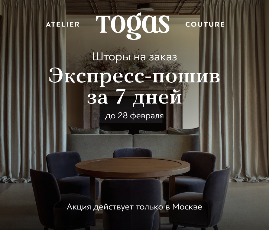 До конца февраля закажите индивидуальный пошив штор до конца февраля, и мы сошьем их всего за 7 дней! Более 7 000 тканей, карнизов и аксессуаров для воплощения ваших идей уже ждут вас в бутике Togas.
