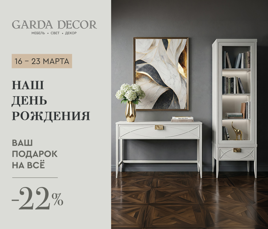 С 16 по 23 марта включительно — праздничная неделя Garda Decor – скидка 22% на весь ассортимент. Мебель, свет, зеркала, изысканный декор и текстиль — всё, что помогает создать интерьер с характером и настроением.