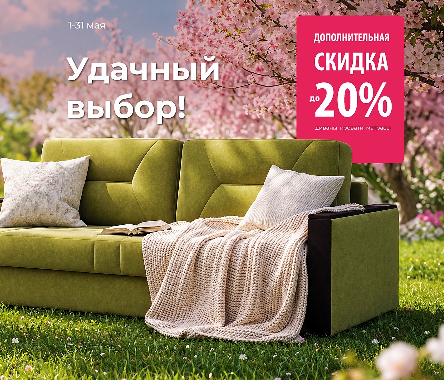 Весь май дополнительная скидка до 20% действует на мягкую мебель, кровати и матрасы!
