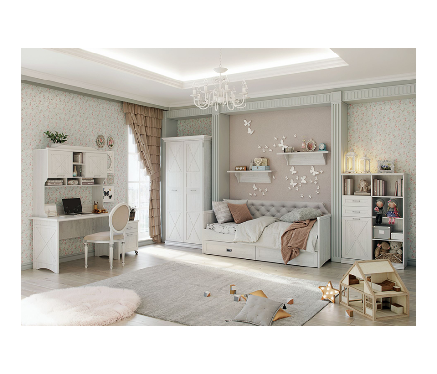 Состав:Тумба Кантри КА-302.06, Д1 — 1 шт;Шкаф Кантри КА-266.05, Д1 — 1 шт;Стол письменный Кантри КА-504.09, Д1 — 1 шт;Стеллаж-надстройка Кантри КА-720.02, Д1 — 1 шт;Шкаф Кантри КА-202.01 — 1 шт.Карниз Кантри КА-013.03 — 2 шт;Комплект цоколей Кантри КА-012.03 — 1 шт;Полка настенная КА-022.03, Д1 — 2 шт;Кровать Кантри КА-830.25, Д1 — 1 шт;Мягкий элемент Кантри КА-900.25 — 1 шт.Характеристики:Цвет: блан-шене;Цвет лицевой фурнитуры: античное железо;Фасады с декоративными элементами — фахверками из композитного материала и декоративными профилями из МДФ;Для отдельно стоящих шкафов необходимо крепление к стене;Основание кровати — ортопедическое. Матрас приобретается отдельно;Размер спального места: 90 х 200 см.Материалы:Мебель сделана из ламинированной плиты ДСП класса эмиссии Е1;Фасады: рамочной конструкции из профиля МДФ, окутанного бумагой с «финиш-эффектом», вставки из ЛДСП 0,6 см;Для облицовывания кромок деталей используется высококачественный материал от ключевых производителей;Задние стенки шкафов: ДВП;Регулируемые металлические опоры скрыты декоративным цоколем из профиля МДФ;Для детской используется крепежная фурнитура и механизмы ведущих производителей;Петли оснащены демпфером для плавного закрывания дверей;В выдвижных ящиках используются направляющие скрытого монтажа со встроенным доводчиком. Это позволяет легко и почти бесшумно выдвигать-задвигать ящики, а также обеспечивает надежную фиксацию ящика и гарантирует длительный срок службы даже при высокой нагрузке.