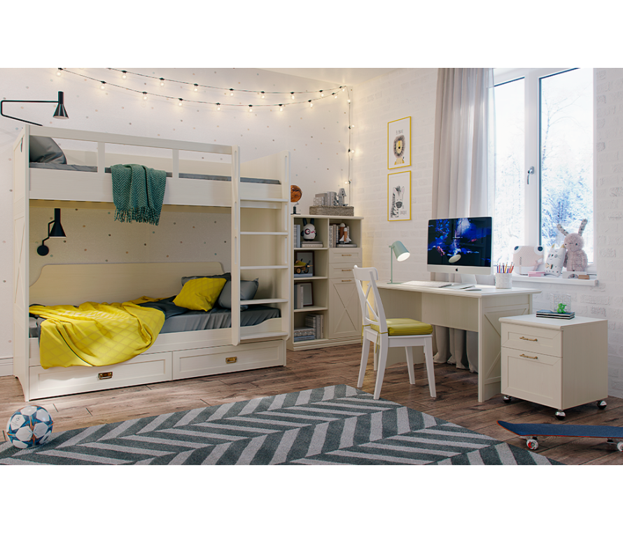 Состав:Кровать двухъярусная Кантри КА-845.25 - 1 шт;Шкаф Кантри КА-266.05, Д1 — 1 шт;Стол письменный Кантри КА-504.09, Д1 — 1 шт;Тумба Кантри КА-302.06, Д1 — 1 шт.Особенности:Коллекция Кантри — это атмосфера домашнего уюта и тепла. Детская Кантри отправляет нас в безмятежный загородный дом, наполненный солнечным светом, спокойствием и гармонией;Здесь можно сосредоточиться на важной работе, заняться творчеством или расслабиться и отдохнуть после трудного учебного дня;Создайте максимально комфортное пространство для ребенка, окружите его теплом и заботой вместе с новой подростковой Кантри.Характеристики:Цвет: валенсия;Цвет лицевой фурнитуры: античная бронза;Фасады с декоративными элементами — фахверками из композитного материала и декоративными профилями из МДФ;Для отдельно стоящих шкафов необходимо крепление к стене;Основание кровати — ортопедическое. Матрас приобретается отдельно.Материалы:Мебель сделана из ламинированной плиты ДСП класса эмиссии Е1;Фасады: рамочной конструкции из профиля МДФ, окутанного бумагой с «финиш-эффектом», вставки из ЛДСП 0,6 см;Для облицовывания кромок деталей используется высококачественный материал от ключевых производителей;Задние стенки шкафов: ДВП;Регулируемые металлические опоры скрыты декоративным цоколем из профиля МДФ;Для детской используется крепежная фурнитура и механизмы ведущих производителей;Петли оснащены демпфером для плавного закрывания дверей;В выдвижных ящиках используются направляющие скрытого монтажа со встроенным доводчиком. Это позволяет легко и почти бесшумно выдвигать-задвигать ящики, а также обеспечивает надежную фиксацию ящика и гарантирует длительный срок службы даже при высокой нагрузке.