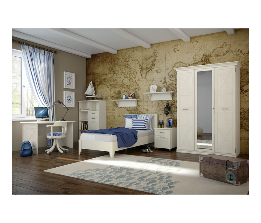 Состав:Кровать Кантри КА-800.25(С2) — 1 шт.Шкаф Кантри КА-266.05, Д1 — 1 шт.Тумба Кантри КА-302.06, Д1 — 1 шт.Стол письменный Кантри КА-504.09, Д1 — 1 шт.Полка Кантри КА-022.03,Д1 — 2 шт.Шкаф Кантри КА-172.03 — 1 шт.Характеристики:Цвет: валенсия;Цвет лицевой фурнитуры: античная бронза;Фасады с декоративными элементами — фахверками из композитного материала и декоративными профилями из МДФ;Для отдельно стоящих шкафов необходимо крепление к стене;Основание кровати — ортопедическое. Матрас приобретается отдельно;Размер спального места: 90 х 200 см;В габаритах указаны размеры кровати.Материалы:Мебель сделана из ламинированной плиты ДСП класса эмиссии Е1;Фасады: рамочной конструкции из профиля МДФ, окутанного бумагой с «финиш-эффектом», вставки из ЛДСП 0,6 см;Для облицовывания кромок деталей используется высококачественный материал производства Германии, Австрии;Задние стенки шкафов: ДВП;Регулируемые металлические опоры скрыты декоративным цоколем из профиля МДФ;Для детской используется крепежная фурнитура и механизмы ведущих производителей (Titus, Hettich);Петли Sensys оснащены демпфером для плавного закрывания дверей;В выдвижных ящиках используется система скрытых направляющих Quadro (Hettich, Германия) с функцией «встроенного демпфера». Это позволяет легко и почти бесшумно выдвигать-задвигать ящики, а также обеспечивает надежную фиксацию ящика и гарантирует длительный срок службы даже при высокой нагрузке.Представленный комплект содержит все необходимое для обустройства элегантной молодежной комнаты в стиле кантри, прованс или классика. Длинная односпальная кровать с высокой спинкой на скошенных ножках поможет с комфортом разместиться на ночной отдых и облегчит уборку подкроватного пространства. Лаконичный письменный стол идеально подойдет подростку или студенту. Трехстворчатый шкаф и двухсекционный шкаф-тумба позволят рационально использовать полезную площадь. В роли дополнительных систем хранения выступают компактная тумбочка и настенная полка. Светлый оттенок покрытия «валенсия» подчеркнут темной фурнитурой в цвете «античная бронза». За счет четкой геометрии, изящных карнизов, тонких линий фахверков и фрезеровки мебель выглядит легкой и визуально расширяет помещение. Невысокие цоколи хорошо скрывают регулируемые металлические опоры. При изготовлении комплекта производитель использовал такие экологичные материалы, как ЛДСП, МДФ-профиль и ДВП.