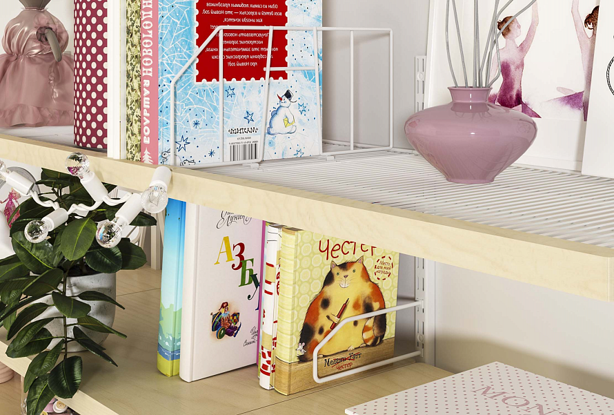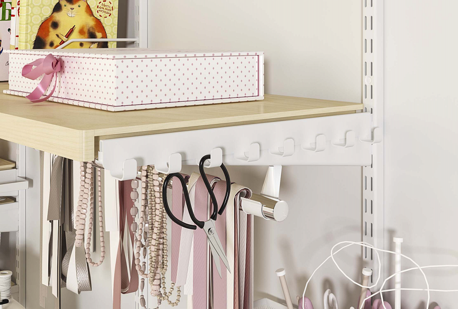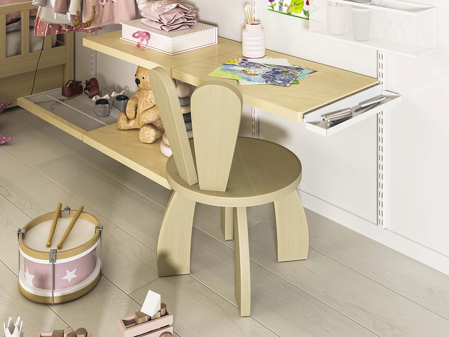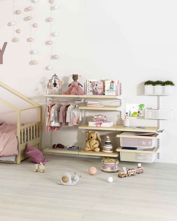 Детская — особый мир ребенка. Здесь он растет, развивается и каждый день учится новому. Чтобы малышу было легче познавать этот мир, комната должна соответствовать его возрасту и росту: сам выбрал одежду, сам достал игрушку, сам убрал её на место. Гардеробная система способствует гармоничному взрослению — с самых первых шагов она подстраивается под малыша. Низкая открытая система хранения соответствует росту малыша: он свободно дотягивается до всех полок и может самостоятельно убирать вещи. Комплексное хранение в одном месте с делением на тематические зоны — гардероб, игрушки, творчество — приучает ребёнка к системности и порядку. Надёжное крепление к стене безопасно даже если ребенок вскарабкается на самый верх — полки легко выдерживают нагрузку до 40 кг. Скруглённые углы конструкции, натуральные материалы (конструкционная сталь и массив дерева) безопасны для ребенка — система рекомендована для медицинских и детских учреждений. Встроенный стол для занятий позволяет внимательно подобрать высоту столешницы и сэкономить пространство. Размер столешницы 605х437 мм оптимален для детей до 5 лет. Полку можно установить на любой высоте, следуя правилу “локтя”: садясь на стул и сгибая руки в локтях под прямым углом, локти ребенка должны оказаться на одном уровне со столешницей. Выбирайте сетчатые корзины на доводчиках. Они легко выдвигаются и безопасны для детских ручек: в отличии от ящиков ими невозможно прищемить пальцы при закрывании.