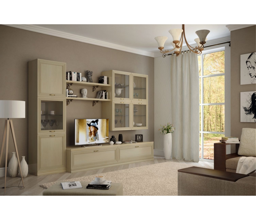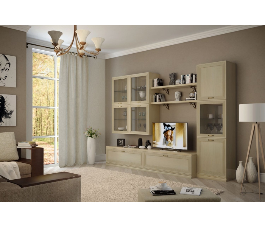 Состав:Шкаф Адажио АГ-224.20, Д1 — 1 шт;Шкаф навесной Адажио АГ-418.03, Д1 — 2 шт;Полка навесная Адажио АГ-023.03 — 2 шт;Тумба Адажио АГ-369.01 — 1 шт.Особенности:Адажио — это традиционное прочтение итальянской классики. Мебель из коллекции подойдет не только к классическим интерьерам, но и к гостиным в стилях фьюжн, контемпорари и эклектика;Гостиная Адажио понравится семейным людям, ценителям классики и традиций. Она создана для уютных вечеров с близкими людьми, размеренному чтению любимых книг и просто приятных кинопросмотров за кружкой чая;Гостиная будет гармонировать с пастельными оттенками бирюзы, синего, терракотового, теплого серого. Если же вы хотите добавить акцентов в декоре — используйте глубокие оттенки тонов, перечисленных выше.Характеристики:Мебель выполнена в цвете «валенсия». Фасады вручную покрыты патиной и испанским лаком, который отличается повышенной атмосферо- и светостойкостью и не желтеет со временем;В гостиной есть вся необходимая мебель для хранения: напольный шкаф, два навесных шкафа, тумба с двумя выдвижными ящиками и две вместительные полки. Для самого важного всегда найдется место;На задних стенках шкафов со стеклянными вставками есть зеркала. Это помогает зрительно расширить комнату.Материалы:Вся лицевая фурнитура в коллекции Адажио выполнена из латуни в стильном оттенке «старая бронза»;Для гостиной используется крепежная фурнитура и механизмы ведущих производителей (Titus, Hettich). Такая фурнитура позволит мебели прослужить дольше, не требуя частого ремонта;Для плавного закрывания дверей используются петли Titus с накладным демпфером (с возможностью регулирования степени «демпфирования»);В выдвижных ящиках используется система скрытых направляющих Quadro (Hettich, Германия) с функцией «стоп-контроль». Это дает возможность легко и почти бесшумно выдвигать-задвигать ящики, а также обеспечивает надежную фиксацию ящика и гарантирует длительный срок службы даже при высокой нагрузке;Полки навешиваются на стену на декоративных менсолодержателях (МакМарт);Подвеска настенных шкафов итальянского производства Camar.Для создания еще более гармоничного интерьера в гостиную можно дополнительно подобрать диван простой формы в кремовых оттенках (как классического, так и более современного прочтения), изящный журнальный столик с металлическими деталями в тон фурнитуры. Если же вы хотите совместить гостиную с рабочей зоной — не забудьте про удобный стол на высоких ножках.