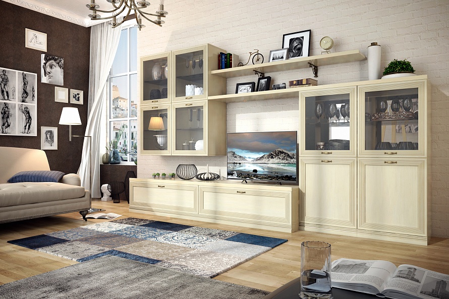 Состав:Шкаф навесной Адажио АГ-418.03, Д1 — 2 шт;Шкаф Адажио АГ-260.02, Д1 — 2 шт;Полка настенная Адажио АГ-026.03 — 1 шт;Полка навесная Адажио АГ-025.03 — 1 шт;Тумба Адажио АГ-369.01 — 1 шт.Особенности:Адажио — это традиционное прочтение итальянской классики. Мебель из коллекции подойдет не только к классическим интерьерам, но и к гостиным в стилях фьюжн, контемпорари и эклектика;Гостиная Адажио понравится семейным людям, ценителям классики и традиций. Она создана для уютных вечеров с близкими людьми, размеренному чтению любимых книг и просто приятных кинопросмотров за кружкой чая;Гостиная будет гармонировать с пастельными оттенками бирюзы, синего, терракотового, теплого серого. Если же вы хотите добавить акцентов в декоре — используйте глубокие оттенки тонов, перечисленных выше.Характеристики:Мебель выполнена в цвете «валенсия». Фасады вручную покрыты патиной и испанским лаком, который отличается повышенной атмосферо- и светостойкостью и не желтеет со временем;Вся лицевая фурнитура в коллекции Адажио сделана из латуни в стильном оттенке «старая бронза»;В гостиной есть вся необходимая мебель для хранения: два напольных и два навесных шкафа, тумба с двумя выдвижными ящиками и две вместительные полки. Для самого важного всегда найдется место;У шкафов на задних стенках верхних отделений есть зеркала. Это помогает зрительно расширить комнату.Материалы:Для гостиной используется крепежная фурнитура и механизмы ведущих производителей (Titus, Hettich). Такая фурнитура позволит мебели прослужить дольше, не требуя частого ремонта;Для плавного закрывания дверей используются петли Titus с накладным демпфером (с возможностью регулирования степени «демпфирования»);В выдвижных ящиках используется система скрытых направляющих Quadro (Hettich, Германия) с функцией «стоп-контроль». Это дает возможность легко и почти бесшумно выдвигать-задвигать ящики, а также обеспечивает надежную фиксацию ящика и гарантирует длительный срок службы даже при высокой нагрузке;Полка АГ-025.03 навешивается на стену на декоративных менсолодержателях (МакМарт);Подвеска настенных шкафов итальянского производства Camar.Асимметричное решение в мягком цвете «Адажио» будет выгодно смотреться не только в классическом интерьере, но и в помещении с современной отделкой в стиле эклектика, неоклассика, контемпорари.Модульная система позволит регулярно менять внешний вид гостиной по своему усмотрению. В комплект входит два навесных шкафа-витрины, напольные шкафы с застекленными вставками и глухими нижними фасадами, настенные полки и вместительная ТВ-тумба.Сдержанная роскошь проявляется в деталях: элегантные латунные ручки, фрезерованные филенки, изящные витые менсолодержатели. Ручное патинирование придает фасадам налет старины, качественное лаковое покрытие устойчиво к выцветанию, не желтеет со временем. Надежная, продуманная фурнитура — петли с доводчиками, накладные демпферы, скрытые направляющие — превращает эксплуатацию гарнитура в истинное удовольствие.