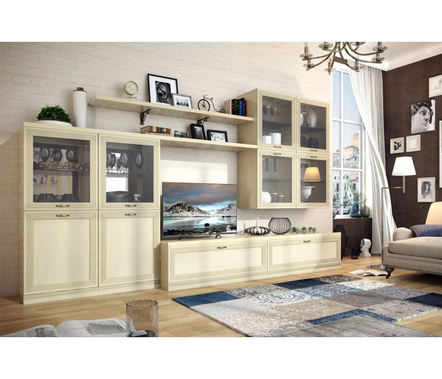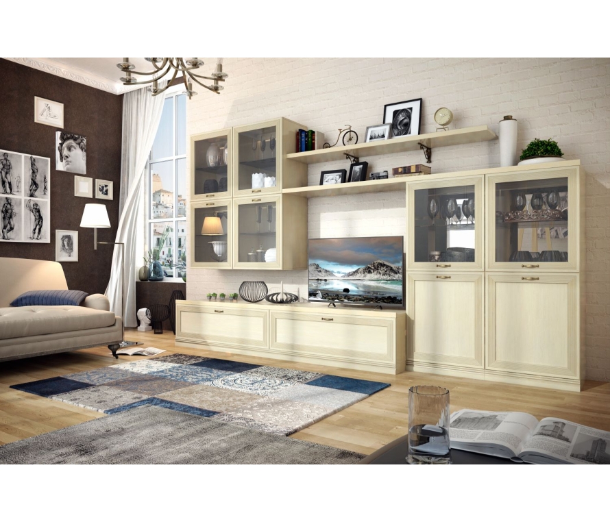 Состав:Шкаф навесной Адажио АГ-418.03, Д1 — 2 шт;Шкаф Адажио АГ-260.02, Д1 — 2 шт;Полка настенная Адажио АГ-026.03 — 1 шт;Полка навесная Адажио АГ-025.03 — 1 шт;Тумба Адажио АГ-369.01 — 1 шт.Особенности:Адажио — это традиционное прочтение итальянской классики. Мебель из коллекции подойдет не только к классическим интерьерам, но и к гостиным в стилях фьюжн, контемпорари и эклектика;Гостиная Адажио понравится семейным людям, ценителям классики и традиций. Она создана для уютных вечеров с близкими людьми, размеренному чтению любимых книг и просто приятных кинопросмотров за кружкой чая;Гостиная будет гармонировать с пастельными оттенками бирюзы, синего, терракотового, теплого серого. Если же вы хотите добавить акцентов в декоре — используйте глубокие оттенки тонов, перечисленных выше.Характеристики:Мебель выполнена в цвете «валенсия». Фасады вручную покрыты патиной и испанским лаком, который отличается повышенной атмосферо- и светостойкостью и не желтеет со временем;Вся лицевая фурнитура в коллекции Адажио сделана из латуни в стильном оттенке «старая бронза»;В гостиной есть вся необходимая мебель для хранения: два напольных и два навесных шкафа, тумба с двумя выдвижными ящиками и две вместительные полки. Для самого важного всегда найдется место;У шкафов на задних стенках верхних отделений есть зеркала. Это помогает зрительно расширить комнату.Материалы:Для гостиной используется крепежная фурнитура и механизмы ведущих производителей (Titus, Hettich). Такая фурнитура позволит мебели прослужить дольше, не требуя частого ремонта;Для плавного закрывания дверей используются петли Titus с накладным демпфером (с возможностью регулирования степени «демпфирования»);В выдвижных ящиках используется система скрытых направляющих Quadro (Hettich, Германия) с функцией «стоп-контроль». Это дает возможность легко и почти бесшумно выдвигать-задвигать ящики, а также обеспечивает надежную фиксацию ящика и гарантирует длительный срок службы даже при высокой нагрузке;Полка АГ-025.03 навешивается на стену на декоративных менсолодержателях (МакМарт);Подвеска настенных шкафов итальянского производства Camar.Асимметричное решение в мягком цвете «Адажио» будет выгодно смотреться не только в классическом интерьере, но и в помещении с современной отделкой в стиле эклектика, неоклассика, контемпорари.Модульная система позволит регулярно менять внешний вид гостиной по своему усмотрению. В комплект входит два навесных шкафа-витрины, напольные шкафы с застекленными вставками и глухими нижними фасадами, настенные полки и вместительная ТВ-тумба.Сдержанная роскошь проявляется в деталях: элегантные латунные ручки, фрезерованные филенки, изящные витые менсолодержатели. Ручное патинирование придает фасадам налет старины, качественное лаковое покрытие устойчиво к выцветанию, не желтеет со временем. Надежная, продуманная фурнитура — петли с доводчиками, накладные демпферы, скрытые направляющие — превращает эксплуатацию гарнитура в истинное удовольствие.
