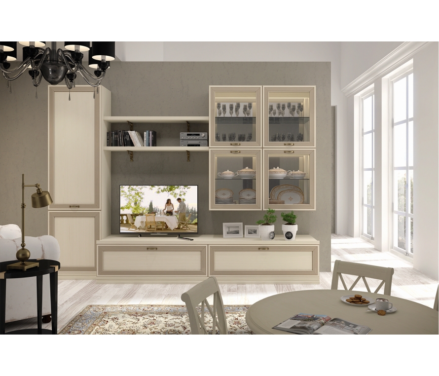 Состав:Шкаф навесной Адажио АГ-418.03, Д1 — 2 шт;Шкаф Адажио АГ-224.13, Д1 — 1 шт;Тумба Адажио АГ-369.01 — 1 шт;Полка навесная Адажио АГ-023.03 — 2 шт.Особенности:Адажио — это традиционное прочтение итальянской классики. Мебель из коллекции подойдет не только к классическим интерьерам, но и к гостиным в стилях фьюжн, контемпорари и эклектика;Гостиная Адажио понравится семейным людям, ценителям классики и традиций. Она создана для уютных вечеров с близкими людьми, размеренному чтению любимых книг и просто приятных кинопросмотров за кружкой чая;Гостиная будет гармонировать с пастельными оттенками бирюзы, синего, терракотового, теплого серого. Если же вы хотите добавить акцентов в декоре — используйте глубокие оттенки тонов, перечисленных выше.Характеристики:Мебель выполнена в цвете «валенсия». Фасады вручную покрыты патиной и испанским лаком, который отличается повышенной атмосферо- и светостойкостью и не желтеет со временем;Вся лицевая фурнитура в коллекции Адажио сделана из латуни в стильном оттенке «старая бронза»;В гостиной есть вся необходимая мебель для хранения: напольный шкаф, два навесных шкафа, тумба с двумя выдвижными ящиками и две вместительные полки. Для самого важного всегда найдется место;У навесных шкафов на задних стенках верхних отделений есть зеркала. Это помогает зрительно расширить комнату;Напольный шкаф оборудован горизонтальной стойкой и выдвижной штангой для одежды. Дополнительно вы можете установить один или два комплекта полок АГ-006.00.Материалы:Для гостиной используется крепежная фурнитура и механизмы ведущих производителей (Titus, Hettich). Такая фурнитура позволит мебели прослужить дольше, не требуя частого ремонта;Для плавного закрывания дверей используются петли Titus с накладным демпфером (с возможностью регулирования степени «демпфирования»);В выдвижных ящиках используется система скрытых направляющих Quadro (Hettich, Германия) с функцией «стоп-контроль». Это дает возможность легко и почти бесшумно выдвигать-задвигать ящики, а также обеспечивает надежную фиксацию ящика и гарантирует длительный срок службы даже при высокой нагрузке;Полки навешиваются на стену на декоративных менсолодержателях (МакМарт);Подвеска настенных шкафов итальянского производства Camar.Для создания еще более гармоничного интерьера в гостиную можно дополнительно подобрать диван простой формы в кремовых оттенках (как классического, так и более современного прочтения), изящный журнальный столик с металлическими деталями в тон фурнитуры. Если же вы хотите совместить гостиную с рабочей зоной — не забудьте про удобный стол на высоких ножках.
