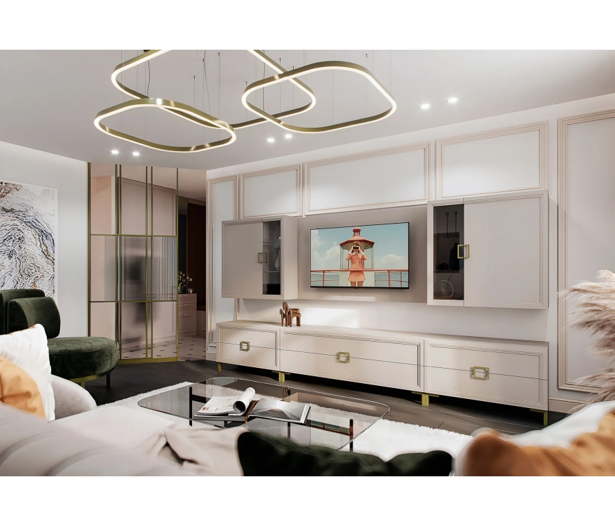 Уютный мебельный гарнитур в сдержанном теплом оттенке дополнит интерьер в стиле минимализм или ар-деко. В комплект входят три вместительные тумбы с выдвижными ящиками и 2 компактных навесных шкафа с горизонтальными отсеками. Рамочный фасад имеет вставку из тонированного стекла, внутри расположены прочные стеклянные полки. Завершающим штрихом композиции служит деревянная ТВ-панель, по длине соответствующая нижней тумбе, за лицевой частью которой установлена LED-подсветка.Состав:Шкаф настенный ДЛ-424.08 - 2 шт;Тумба ДЛ-316.03 - 1 шт;Тумба ДЛ-312.03 - 2 шт.;Панель настенная ДЛ-024.00 (Кашемир серый) - 1 шт.Характеристики:Цвет: кашемир серый;Цвет задней стенки шкафа за рамочным фасадом из стекла: трюфель коричневый;Цвет ручек: золото;Шкафы настенные с одним глухим фасадом и одним рамочным со вставкой стекло тонированное. Внутреннее наполнение: стеклополки 0,6 см за стеклянным фасадом и ЛДСП 1,6 см за глухим фасадом. Максимальная нагрузка (вес, размещенный внутри шкафа) — не более 30 кг, при этом на нижнюю крышку (нижнее отделение) нагрузка должна быть не более 3 кг (нагрузка зависит от крепления к стене и материала стены);Тумба ДЛ-316.03 с четырьмя выдвижными ящиками (за одним фасадом по 2 ящика);Тумба ДЛ-312.03 (2 шт.) с двумя выдвижными ящиками;Тумбы нужно использовать по назначению, не допускать установки тяжелых предметов на верхнюю крышку. Максимально возможная распределенная нагрузка на верхнюю крышку — не более 8 кг;В выдвижной ящик можно класть не более 5-7 кг, при этом нагрузка должна быть распределена по всему дну (не класть тяжелые предметы, которые могут повредить и выдавить дно);Тумбы необходимо крепить к стене во избежание опрокидывания;Панель навешивается на стену. За лицевой панелью устанавливается светодиодная лента подсветки.Материалы:Корпус: ЛДСП толщиной 1,6 см класса эмиссии Е1;Фасады: ЛДСП 1,6 см с наклеенным профилем, рамочный фасад со вставкой из тонированного стекла;Для облицовывания кромок деталей используется высококачественный материал производства Германии, Австрии;Крепежная фурнитура и механизмы ведущих производителей (Titus, Hettiсh);Для выдвижных ящиков используется система скрытых направляющих Quadro со встроенным демпфером (Германия, Hettich).