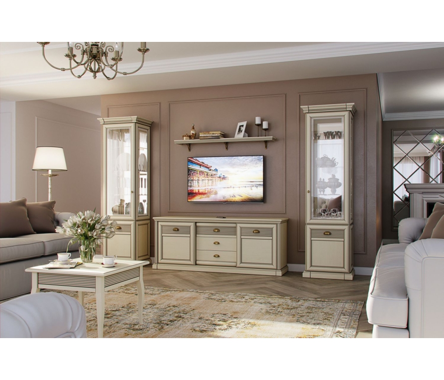 Состав:Шкаф Изотта ИТ-224.29 — 2 шт;Тумба Изотта ИТ-350.05 — 1 шт;Полка Изотта ИТ-025.03 — 1 шт.Особенности:Массивная, основательная и респектабельная Изотта — это традиционное прочтение итальянской классики. Мебель из коллекции подойдет к традиционным классическим, неоклассическим и эклектическим интерьерам;В зависимости от вашего желания создать мягкий и спокойный интерьер, или, наоборот, сделать акценты — выбирайте для декора кремовые оттенки, бордовый, глубокий синий и теплый серый;Гостиная Изотта понравится тем, кто любит и ценит традиции, уютные семейные вечера и хочет подчеркнуть свой вкус и статус. Такая мебель так и просит быть в центре внимания, поэтому домашние приемы будут очень даже кстати (гости оценят!).Характеристики:Мебель выполнена в цвете «валенсия». Фасады вручную покрыты патиной и испанским лаком, который отличается повышенной атмосферо- и светостойкостью и не желтеет со временем;Вся лицевая фурнитура в коллекции Изотта сделана из латуни в стильном оттенке «античная бронза»;В гостиной есть вся необходимая мебель для хранения: два напольных шкафа, тумба с раздвижным механизмом и полка. Для самого важного всегда найдется место;У напольных шкафов со стеклянными вставками на задних стенках есть зеркала. Это помогает зрительно расширить комнату.Материалы:Для гостиной используется крепежная фурнитура и механизмы ведущих производителей (Titus, Hettich, МакМарт). Такая фурнитура позволит мебели прослужить дольше, не требуя частого ремонта;Петли Sensys оснащены доводчиками для более плавного закрывания дверей;Механизм дверей тумбы раздвижной — TERNO6;В выдвижных ящиках тумбы используется система скрытых направляющих Quadro с функцией Silent System. Это позволяет легко и почти бесшумно выдвигать-задвигать ящики, а также обеспечивает надежную фиксацию ящика и гарантирует длительный срок службы даже при высокой нагрузке.Для завершения интерьера вы можете дополнительно подобрать к гостиной винтажную (или околовинтажную) мебель в стиле барокко или неоклассика. Например, изящную бархатную кушетку и маленький круглый столик на металлических ножках. Если же вы склоняетесь в сторону эклектики — обратите внимание на акцентный диван простой формы, современные кресла в глубоких оттенках и минималистичные аксессуары.