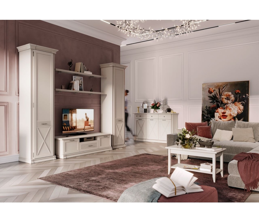Состав:Шкаф Кантри КА-214.01 (левый) — 1 шт;Шкаф Кантри КА-214.01 (правый) — 1 шт;Тумба Кантри КА-315.11 — 1 шт;Полка Кантри КА-024.03 — 2 шт;Комод Кантри КА-104.11 — 1 шт;Стол журнальный Кантри КА-520.09 — 1 шт;Колонна завершающая Кантри КА-015.11 — 4 шт.Особенности:Гостиная в классическом стиле Кантри — одна из любимых коллекций наших клиентов. Такая мебель подойдет к интерьерам в стилях прованс, кантри, неоклассика или сканди. При создании этой коллекции наш дизайнер вдохновлялась самобытной архитектурой Германии с ее характерной фахверковой системой;Гостиная будет гармонировать как с яркими оттенками (бирюзовым, горчичным), так и с приглушенными (пастельно-зеленым, пудрово-розовым), а также со всеми оттенками серого;Коллекция понравится тем, кто ценит легкость и ищет для себя актуальную и самобытную классику. Кантри, как европейская архитектура, существует вне моды и легко трансформируется под ваш вкус.Характеристики:Мебель выполнена в актуальном цвете - «Кашемир серый»;Вся лицевая фурнитура в коллекции Кантри сделана в стильном оттенке «античное железо»;Шкафы украшены изящными фахверками. Эти декоративные элементы отсылают к Старой Европе и создают дополнительные неброские акценты в интерьере;Для хранения в гостиной предусмотрены два шкафа, укомплектованные полками ЛДСП и комод;В комплекте к шкафам идут четыре завершающие колонны, чтобы сделать гостиную более гармоничной. Они устанавливаются с краю композиции или в середине между модулями.Материалы:Корпус мебели изготовлен из ЛДСП;Фасады: рамочной конструкции из МДФ профиля, в фасадах вставки из ЛДСП 6 мм;Для гостиной используется крепежная фурнитура и механизмы ведущих производителей. Такая фурнитура позволит мебели прослужить дольше, не требуя частого ремонта. Петли оснащены доводчиками для более плавного закрывания дверей;В выдвижных ящиках используются направляющие скрытого монтажа со встроенным доводчиком. Это позволяет легко и почти бесшумно выдвигать-задвигать ящики, а также обеспечивает надежную фиксацию ящика и гарантирует длительный срок службы даже при высокой нагрузке.С этой мебелью будут хорошо сочетаться аксессуары в стиле неоклассика, ковры с винтажным потертым рисунком, яркий прямой или угловой диван (если захотите добавить акцентов). Если же вам нравится более спокойный интерьер — можно выбрать диван или кресла в серых оттенках. Конечно же, не забудьте про журнальный столик на высоких ножках.