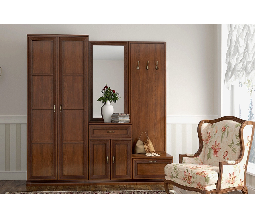 Состав:Шкаф Адажио АГ-204.01 — 1 шт;Тумба Адажио АГ-305.08 — 1 шт;Зеркало Адажио АГ-600.05 — 1 шт;Панель с крючками Адажио АГ-021.05 — 1 шт;Комплект цоколей Адажио АГ-012.01 — 1 шт;Тумба Адажио АГ-112.05 — 1 шт.Особенности:Адажио — образец сдержанности и изящества, стиля и элегантности. Такая мебель подойдет не только к классическим интерьерам, но и к прихожим в стилях фьюжн, контемпорари и эклектика;Прихожая будет гармонировать с пастельными, кремовыми оттенками, оттенками теплого серого. Если же вы хотите добавить акцентов в декоре — используйте глубокие тона синего, зеленого, терракотового;Коллекция Адажио понравится семейным людям, ценителям классики и традиций.Характеристики:Мебель выполнена в цвете «клен старый»;Лицевая фурнитура сделана в стильном оттенке «старинная латунь»;Для отдельно стоящего шкафа необходимо крепление к стене;Регулируемые опоры;Вместительный шкаф и вешалки позволят разместить верхнюю одежду, а тумбочки сохранят в чистоте обувь и аксессуары.Материалы:Корпус: ламинированная плита ДСП класса эмиссии Е1;Фасады: ЛДСП с наклеенным профилем из МДФ;Декоративная панель: каркас ЛДСП с профилем МДФ;Зеркало — в рамочном профиле МДФ;Отделка фасадов выполнена испанским шелковисто-матовым лаком и патиной (эффект состаренного дерева);Опоры — металлические, скрыты декоративным цоколем из профиля МДФ;Лицевая фурнитура: латунь;Петли оснащены накладными демпферами-доводчиками для «мягкого» закрывания распашных дверей;Фасад тумбы для обуви откидывается вниз с помощью кронштейна;В выдвижном ящике направляющие «квадро» с функцией «стоп-контроль».