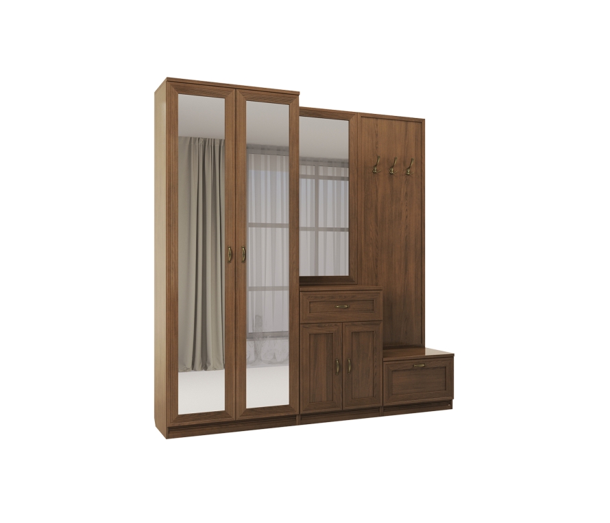 Состав:Шкаф Адажио АГ-204.02 — 1 шт;Панель с крючками Адажио АГ-021.05 — 1 шт;Тумба Адажио АГ-305.08 — 1 шт;Зеркало Адажио АГ-600.05 — 1 шт;Тумба Адажио АГ-112.05 — 1 шт;Комплект цоколей Адажио АГ-012.01 — 1 шт.Особенности:Адажио — образец сдержанности и изящества, стиля и элегантности. Такая мебель подойдет не только к классическим интерьерам, но и к прихожим в стилях фьюжн, контемпорари и эклектика;Прихожая будет гармонировать с пастельными, кремовыми оттенками, оттенками теплого серого. Если же вы хотите добавить акцентов в декоре — используйте глубокие тона синего, зеленого, терракотового;Коллекция Адажио понравится семейным людям, ценителям классики и традиций.Характеристики:Мебель выполнена в цвете «клен старый»;Лицевая фурнитура сделана в стильном оттенке «старинная латунь»;Для отдельно стоящего шкафа необходимо крепление к стене;Опоры — регулируемые;Вместительный шкаф и вешалки позволят разместить верхнюю одежду, тумбочки сохранят в чистоте обувь и аксессуары.Материалы:Корпуса: ламинированная плита ДСП класса эмиссии Е1;Фасады шкафа: ЛДСП, зеркало заключено в раму из профиля МДФ;Фасады тумб: ЛДСП с наклеенным профилем из МДФ;Декоративная панель: каркас ЛДСП с профилем МДФ;Зеркало — в рамочном профиле МДФ;Отделка фасадов выполнена испанским шелковисто-матовым лаком и патиной (эффект состаренного дерева);Опоры — металлические, скрыты декоративным цоколем из профиля МДФ;Лицевая фурнитура: латунь;Петли оснащены накладными демпферами-доводчиками для «мягкого» закрывания распашных дверей;Фасад тумбы для обуви откидывается вниз с помощью кронштейна;В выдвижном ящике используется система скрытых направляющих Quadro с функцией «стоп-контроль». Это позволяет легко и почти бесшумно выдвигать-задвигать ящики, а также обеспечивает надежную фиксацию ящика и гарантирует длительный срок службы даже при высокой нагрузке.