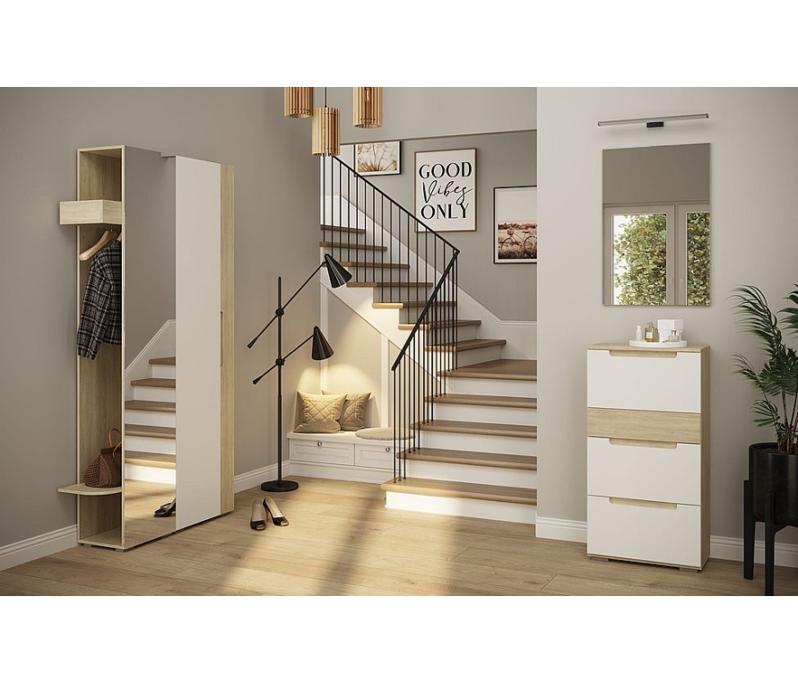 Состав:Комод Анри АН-109.02 — 1 шт;Шкаф Анри АН-223.30 — 1 шт;Стеллаж Анри АН-707.03 — 1 шт.Современная и оригинальная прихожая займет почетное место в доме ценителей стиля сканди, лофт или минимализм. Светлые древесные текстуры разбавлены белыми матовыми фасадами, скрытые эргономичные ручки подчеркивают лаконичность дизайна. Необычные формы соседствуют с гладкими поверхностями.Мебельный гарнитур состоит из:компактного шкафа (комплектация выбирается покупателем);удобного стеллажа со штангой, полкой и встроенным зеркалом;элегантного комода с одним выдвижным ящиком и тремя отсеками с откидной дверцей.Вся мебель устанавливается на прочные широкие ножки, однако во избежание опрокидывания модули рекомендуется крепить к стене. Каркасная часть изготовлена из ламинированной ДСП толщиной 16 мм, фасады произведены из облицованной ПВХ-пленкой МДФ. Кромки отделаны высокопрочным кромочным материалом. Петли, оснащенные доводчиком, скрытые направляющие, демпферы обеспечивают комфортную эксплуатацию комплекта.Характеристики:Цвет корпуса: швейцарский вяз;Цвет фасадов: белый матовый, швейцарский вяз;Опоры — регулируемые;Вы можете самостоятельно выбрать комплектацию шкафа Н-223.30;Необходимо дополнительное крепление модулей к стене.Материалы:Каркас: ЛДСП толщиной 1,6 см;Фасады: МДФ, облицованная пленкой ПВХ;Для облицовывания кромок деталей используется высококачественный материал от ключевых производителей;Для прихожей используется крепежная фурнитура ведущих производителей;Петли оснащены демпфером для более плавного закрывания дверей.