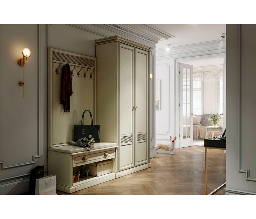 Состав:Шкаф для одежды Изотта ИТ-204.01 (правый) — 1 шт;Тумба для обуви Изотта ИТ-312.02 — 1 шт;Панель с крючками Изотта ИТ-022.11 — 1 шт;Комплект карнизов Изотта ИТ-013.02 — 1 шт;Комплект карнизов и цоколей Изотта ИТ-013.00 — 1 шт;Комплект цоколей Изотта ИТ-012.02 — 1 шт;Мягкий элемент Изотта ИТ-912.02 — 1 шт.Характеристики:Цвет: Валенсия;Цвет лицевой фурнитуры: античная бронза;Регулируемые опоры скрыты декоративным цоколем;Тумба для обуви с выдвижным ящиком;Двухдверный шкаф укомплектован выдвижной штангой для одежды и полками;Модули программы необходимо крепить к стене во избежание опрокидывания.Материалы:Корпус: ЛДСП;Двери в модулях — рамочной конструкции;Для облицовывания кромок деталей используется высококачественный материал европейского производства;Сиденье сделано из плиты МДФ толщиной 0,6 см. Настил подушки сиденья — пенополиуреан (ППУ) толщиной 0,3 см, покрыт спанбондом. Чехол изготовлен из искусственной кожи, декорирован отстрочкой;Лицевая фурнитура выполнена из латуни;Крепежная фурнитура и механизмы ведущих производителей (Titus, Hettich).