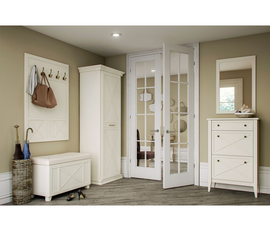Состав:Шкаф Кантри КА-218.24 — 1 шт;Тумба для обуви Кантри КА-115.11 — 1 шт;Банкетка Кантри КА-910.04 — 1 шт;Зеркало Кантри КА-601.01 — 1 шт;Панель с крючками Кантри КА-022.11 — 1 шт;Комплект цоколей Кантри КА-022.11 — 1 шт;Комплект карнизов Кантри КА-013.24 — 1 шт;Особенности:Мебель Кантри воплощает в реальность мечту жителей мегаполиса об уютном домике в деревне. Стиль Кантри настолько многолик и разнообразен, что вписывается в интерьер самого современного жилища;Прихожая Кантри выполнена в светлом древесном декоре «валенсия», теплый и мягкий оттенок которого наполняет пространство уютом;Элемент фахверка, как неотъемлемая часть стиля, находит свое проявление на фасадах. Декоративные петли, ручки и крючки цвета «старая бронза» выполнены в лучших традициях итальянского дизайна.Характеристики:Цвет: валенсия;Цвет лицевой фурнитуры: старая бронза;Шкаф укомплектован двумя полками и евровешалкой. Можно дополнительно заказать полки КА-007.00;Верхнее отделение тумбы — с выдвижным ящиком, две нижние ниши — со съёмными полками за откидными дверями;Крышка банкетки — откидная, с мягким элементом. Буковые опоры покрыты эмалью в цвет корпуса;Модули коллекции необходимо крепить к стене во избежание опрокидывания.Материалы:Мебель выполнена из ламинированной плиты ДСП класса эмиссии Е1;Фасады: рамочные — из профиля МДФ, окутанного бумагой с «финиш-эффектом», вставки из ЛДСП;Задняя стенка шкафа: ДВП в цвет корпуса;Для облицовывания кромок деталей используется высококачественный материал;Регулируемые металлические опоры скрыты декоративным цоколем из МДФ;Для прихожей используется крепежная фурнитура ведущих производителей;Петли оснащены демпфером для плавного закрывания дверей;Для выдвижного ящика используется система скрытых направляющих с функцией «стоп-контроль». Это позволяет легко и почти бесшумно выдвигать-задвигать ящик, обеспечивает надежную фиксацию ящика и гарантирует длительный срок службы даже при высокой нагрузке.