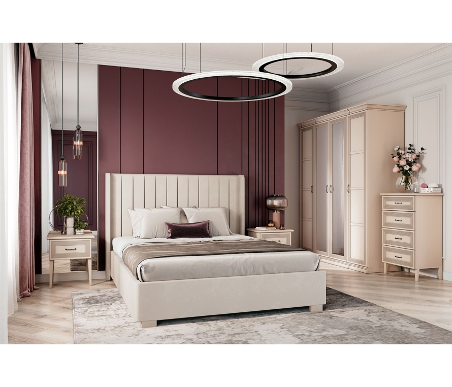 Состав:Кровать Аделия-810.26 (М) — 1 шт;Тумба прикроватная Адажио АГ-300.09 — 2 шт;Шкаф Адажио АГ-201.02 — 1 шт;Шкаф Адажио АГ-211.01 — 2 шт;Комплект завершающих цоколей Адажио АГ-012.03 — 1 шт;Комплект карнизов Адажио АГ-013.03 — 2 шт.Характеристики:Мебель выполнена в цвете «кашемир серый»;Фасады вручную покрыты патиной и испанским лаком, который отличается повышенной атмосферо- и светостойкостью и не меняет цвет со временем;Шкаф с зеркальным фасадом укомплектован полкой, планкой и штангой;Шкаф АГ-211.01 укомплектован штангой для одежды и полкой;Основание кровати — ортопедическое. Матрас приобретается отдельно.Материалы:Корпус модулей выполнен из ЛДСП;Фасады рамочные, с гребенчатым профилем из МДФ;Для спальни используется крепежная фурнитура ведущих производителей (Titus, Hettich). Такая фурнитура позволит мебели прослужить дольше, не требуя частого ремонта;Внешняя фурнитура: латунь;Опоры — металлические;Петли оснащены доводчиками для более плавного закрывания дверей;В выдвижных ящиках используется система скрытых направляющих Quadro. Это дает возможность легко и почти бесшумно выдвигать-задвигать ящики, а также обеспечивает надежную фиксацию ящика и гарантирует длительный срок службы даже при высокой нагрузке.