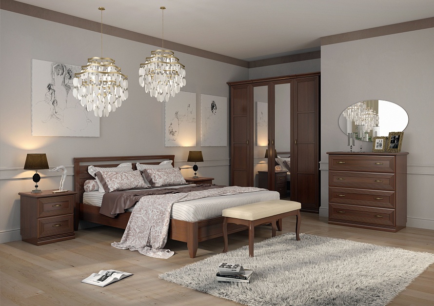 Состав:Кровать Адажио АГ-820.26 — 1 шт;Шкаф Адажио АГ-201.02 (с дополнительным комплектом полок АГ-011.00) — 1 шт;Шкаф Адажио АГ-211.01, Д1 — 2 шт;Тумба прикроватная Адажио АГ-302.04, Д1 — 2 шт.Комод Адажио АГ-101.03 (Я16) - 1 шт;Зеркало Адажио АГ-602.00 - 1 шт.Особенности:Адажио — это традиционное прочтение итальянской классики. Мебель из коллекции подойдет не только к классическим интерьерам, но и к спальням в стилях фьюжн, контемпорари и эклектика;Спальня будет гармонировать с пастельными оттенками бирюзы, синего, терракотового, теплого серого. Если же вы хотите добавить акцентов в декоре — используйте глубокие оттенки тонов, перечисленных выше;Спальня Адажио понравится семейным людям, ценителям классики и традиций. Это идеальное место для начала дня. Утренний кофе, свежие новости или завтрак в постель — в такой спальне хочется баловать себя и радоваться каждому новому дню!Характеристики:Мебель выполнена в цвете «клен старый»;Фасады вручную покрыты патиной и испанским лаком, который отличается повышенной атмосферо- и светостойкостью и не меняет цвет со временем;Вся лицевая фурнитура в коллекции Адажио сделана в стильном оттенке «старая бронза»;Для хранения в спальне есть три удобных шкафа, один из которых с двумя зеркалами. Благодаря этому вы можете увидеть свой образ сразу после переодевания, не выходя в ванную или коридор;Основание кровати — ортопедическое. Матрас приобретается отдельно;Вы можете самостоятельно выбрать комплектацию шкафов.Материалы:Опоры кровати изготовлены из массива бука. Они визуально облегчают пространство и делают комнату более «воздушной»;Для спальни используется крепежная фурнитура ведущих производителей (Titus, Hettich). Такая фурнитура позволит мебели прослужить дольше, не требуя частого ремонта;Петли оснащены доводчиками для более плавного закрывания дверей;В выдвижных ящиках используется система скрытых направляющих Quadro. Это дает возможность легко и почти бесшумно выдвигать-задвигать ящики, а также обеспечивает надежную фиксацию ящика и гарантирует длительный срок службы даже при высокой нагрузке.Чтобы сделать интерьер более завершенным, вы можете дополнительно приобрести аксессуары из металла и графичные постеры в базовых оттенках. Для большего удобства композицию можно завершить мягким пуфом или банкеткой в кремовых оттенках или в тон мебели. Конечно же, не забудьте про туалетный столик, который сделает утренние и вечерние ритуалы еще приятнее.
