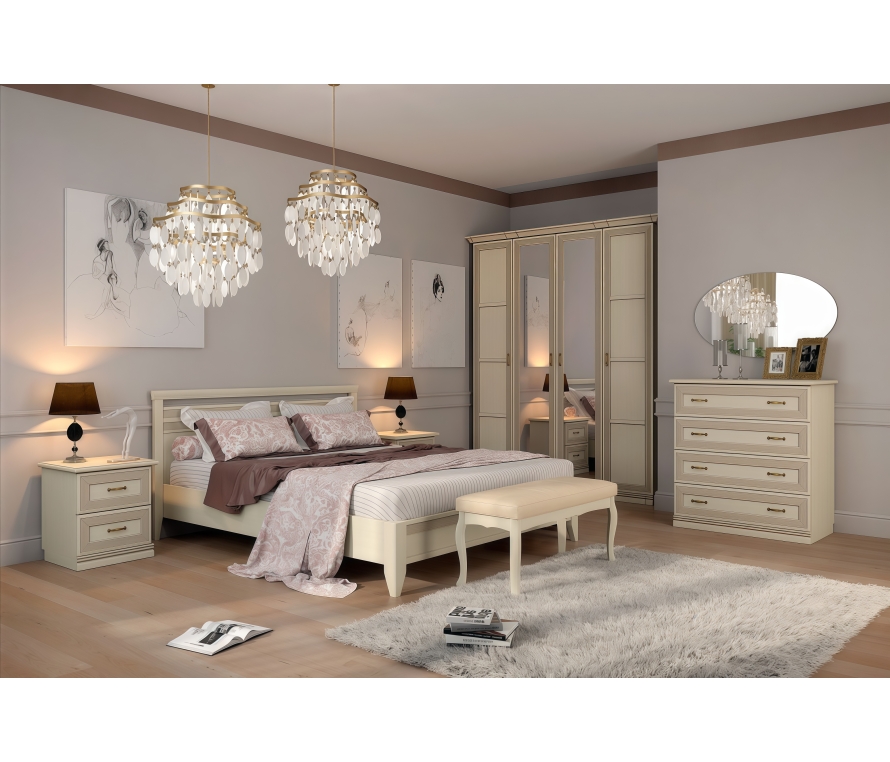 Состав:Кровать Адажио АГ-820.26 — 1 шт;Шкаф Адажио АГ-211.01 — 2 шт;Шкаф Адажио АГ-201.02 — 1 шт;Тумба прикроватная Адажио АГ-302.04 — 2 шт;Комод Адажио АГ-101.03 — 1 шт.Зеркало Адажио АГ-602.00 — 1 шт;Комплект завершающих цоколей Адажио АГ-012.03 — 1 шт;Комплект карнизов Адажио АГ-013.03 — 2 шт;Особенности:Адажио — это традиционное прочтение итальянской классики. Мебель из коллекции подойдет не только к классическим интерьерам, но и к спальням в стилях фьюжн, контемпорари и эклектика;Спальня будет гармонировать с пастельными оттенками бирюзы, синего, терракотового, теплого серого. Если же вы хотите добавить акцентов в декоре — используйте глубокие оттенки тонов, перечисленных выше;Спальня Адажио понравится семейным людям, ценителям классики и традиций. Это идеальное место для начала дня. Утренний кофе, свежие новости или завтрак в постель — в такой спальне хочется баловать себя и радоваться каждому новому дню.Характеристики:Мебель выполнена в цвете «валенсия»;Фасады вручную покрыты патиной и испанским лаком, который отличается повышенной атмосферо- и светостойкостью и не желтеет со временем;Вся лицевая фурнитура в коллекции Адажио сделана в стильном оттенке «старая бронза»;Для хранения в спальне есть три удобных шкафа, один из которых с двумя зеркалами. Благодаря этому вы можете увидеть свой образ сразу после переодевания, не выходя в ванную или коридор;Основание кровати — ортопедическое. Матрас приобретается отдельно;Вы можете самостоятельно выбрать комплектацию шкафов.Материалы:Опоры кровати изготовлены из массива бука. Они визуально облегчают пространство и делают комнату более «воздушной»;Для спальни используется крепежная фурнитура ведущих производителей (Titus, Hettich). Такая фурнитура позволит мебели прослужить дольше, не требуя частого ремонта;Петли оснащены доводчиками для более плавного закрывания дверей;В выдвижных ящиках используется система скрытых направляющих Quadro. Это дает возможность легко и почти бесшумно выдвигать-задвигать ящики, а также обеспечивает надежную фиксацию ящика и гарантирует длительный срок службы даже при высокой нагрузке.Чтобы сделать интерьер более завершенным, вы можете дополнительно приобрести металлические аксессуары в бронзовых оттенках и абстрактные постеры с яркими акцентами. Для большего удобства композицию можно завершить мягким пуфом или банкеткой в тон мебели. Конечно же, не забудьте про туалетный столик, который сделает утренние и вечерние ритуалы еще приятнее.