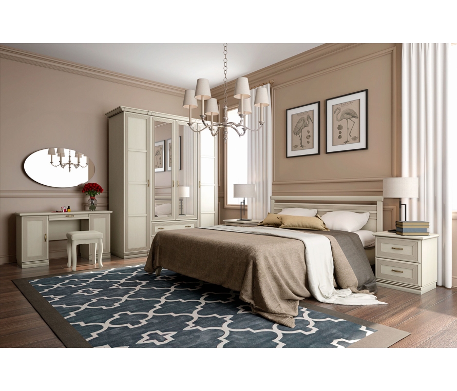 Состав:Кровать Адажио АГ-820.26 — 1 шт;Шкаф Адажио АГ-211.01 — 2 шт;Шкаф Адажио АГ-201.04 — 1 шт;Тумба прикроватная Адажио АГ-302.04 — 2 шт;Стол туалетный Адажио АГ-503.01 — 1 шт;Банкетка Адажио АГ-910.01 — 1 шт.Особенности:Адажио — это традиционное прочтение итальянской классики. Мебель из коллекции подойдет не только к классическим интерьерам, но и к спальням в стилях фьюжн, контемпорари и эклектика;Спальня будет гармонировать с пастельными оттенками бирюзы, синего, терракотового, теплого серого. Если же вы хотите добавить акцентов в декоре — используйте глубокие оттенки тонов, перечисленных выше;Спальня Адажио понравится семейным людям, ценителям классики и традиций. Это идеальное место для начала дня. Утренний кофе, свежие новости или завтрак в постель — в такой спальне хочется баловать себя и радоваться каждому новому дню.Характеристики:Мебель выполнена в цвете «валенсия»;Фасады вручную покрыты патиной и испанским лаком, который отличается повышенной атмосферо- и светостойкостью и не желтеет со временем;Вся лицевая фурнитура в коллекции Адажио сделана в стильном оттенке «старая бронза»;Для хранения в спальне есть четыре удобных шкафа, один из которых с двумя зеркалами. Благодаря этому вы можете увидеть свой образ сразу после переодевания, не выходя в ванную или коридор;Основание кровати — ортопедическое. Матрас приобретается отдельно;Вы можете самостоятельно выбрать комплектацию шкафов.Материалы:Опоры кровати изготовлены из массива бука. Они визуально облегчают пространство и делают комнату более «воздушной»;Для спальни используется крепежная фурнитура ведущих производителей (Titus, Hettich). Такая фурнитура позволит мебели прослужить дольше, не требуя частого ремонта;Петли оснащены доводчиками для более плавного закрывания дверей;В выдвижных ящиках используется система скрытых направляющих Quadro. Это дает возможность легко и почти бесшумно выдвигать-задвигать ящики, а также обеспечивает надежную фиксацию ящика и гарантирует длительный срок службы даже при высокой нагрузке.Чтобы сделать интерьер более завершенным, вы можете дополнительно приобрести металлические аксессуары в бронзовых оттенках и абстрактные постеры с яркими акцентами. Для большего удобства композицию можно завершить мягким пуфом или банкеткой в тон мебели. Конечно же, не забудьте про туалетный столик, который сделает утренние и вечерние ритуалы еще приятнее.