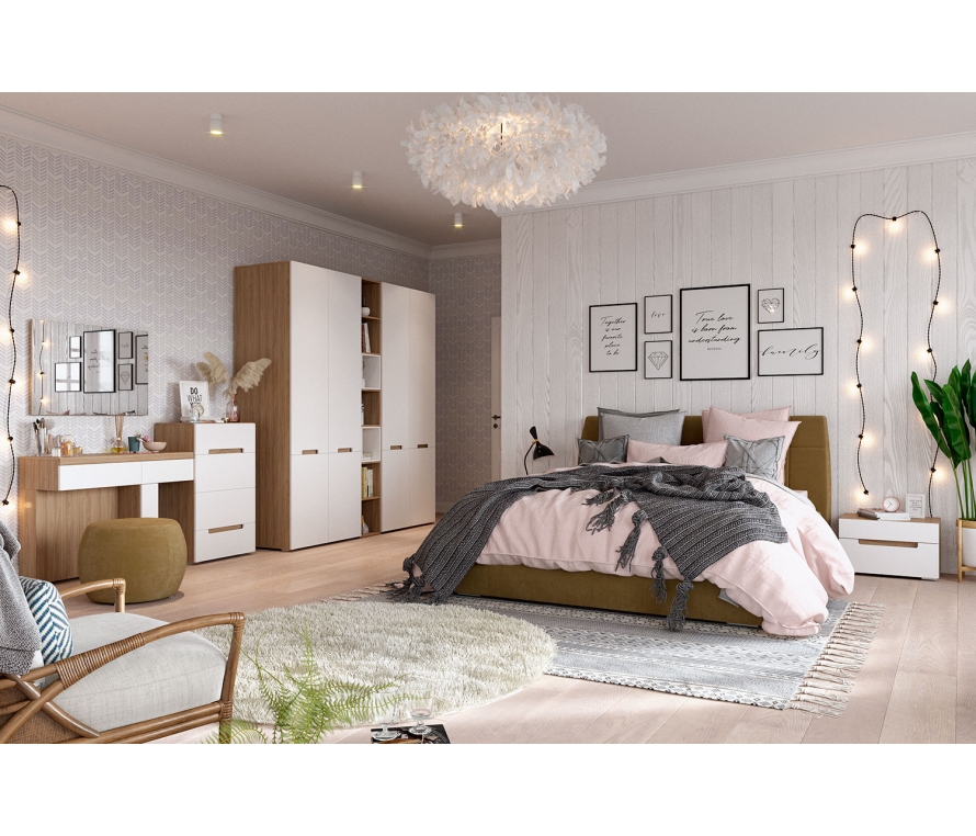 Состав:Шкаф Анри АН-200.01 — 2 шт;Стеллаж Анри АН-701.00 — 1 шт;Тумба прикроватная Анри АН-305.03 — 2 шт;Стол Анри АН-500.11 — 1 шт;Комод Анри АН-113.01 — 1 шт;Зеркало Анри АН-601.00 — 1 шт;Пуф Анри АН-910.01 — 1 шт;Кровать мягкая Анри АН-810.26 — 1 шт.Особенности:Спальня в современном стиле. Такая мебель универсальна и подойдет интерьерам в стилях эко, скандинавский, минимализм и лофт (в его более «легком» варианте);Коллекция будет гармонировать с темными оттенками пастельных тонов, например, коричневым или серым. Если же хотите добавить контраста — выбирайте для декора приглушенные холодные оттенки, например, синий или зеленый;Спальня Анри понравится как современным жителям мегаполиса, которые хотят добавить спокойствия и умиротворения в свою жизнь, так и тем, кто живет за городом и не может представить и дня без деревенской природы.Характеристики:Корпус мебели выполнен в цвете «швейцарский вяз», фасады — в цвете «белый матовый»;Вся мебель из коллекции Анри отличается отсутствием внешних ручек, что делает ее более легкой и воздушной. Все ручки в мебели — скрытые. Это зрительно расширяет пространство и продлевает срок службы мебели;Вы можете самостоятельно выбрать комплектацию шкафов.Материалы:Мягкий каркас кровати выполнен из ППУ, синтепона и спанбонда. Изголовье, передняя и боковые царги кровати обтянуты мягким велюром. Он легко поддается чистке и позволит чувствовать себя в кровати комфортно;Ортопедическая решетка состоит из металлического каркаса и гнуто-клееных лат. Осталось лишь выбрать матрас — и спальное место готово!Для спальни используется крепежная фурнитура и механизмы ведущих производителей. Такая фурнитура позволит мебели прослужить дольше, не требуя частого ремонта. Петли оснащены доводчиками для более плавного закрывания дверей;В выдвижных ящиках используется система скрытых направляющих. Это позволяет легко и почти бесшумно выдвигать-задвигать ящики, а также обеспечивает надежную фиксацию ящика и гарантирует длительный срок службы даже при высокой нагрузке.В зависимости от стиля, который вы хотите создать в вашем доме, можно дополнительно подобрать минималистичные торшеры или стеллажи — для эко или скандинавского стилей, аксессуары из металла или стекла — для «легкого» лофта, графичные постеры — для минималистичного интерьера. Не забудьте про туалетный столик, который сделает утренние и вечерние ритуалы еще приятнее.