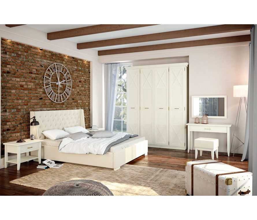 Состав:Кровать Кантри КА-810.26 — 1 шт;Шкаф Кантри КА-200.24 — 1 шт;Шкаф Кантри КА-210.01 — 2 шт;Тумба прикроватная Кантри КА-300.09 — 2 шт;Стол туалетный Кантри КА-500.09 — 1 шт;Зеркало Кантри КА-601.01 — 1 шт;Банкетка Кантри КА-910.01 — 1 шт;Завершающая колонна Кантри КА-015.06 — 2 шт.Особенности:Спальня в классическом стиле. Кантри — одна из любимых коллекций наших клиентов. Такая мебель подойдет к интерьерам в стилях прованс, кантри или сканди. При создании этой коллекции наш дизайнер вдохновлялась самобытной архитектурой Германии с ее характерной фахверковой системой;Спальня будет гармонировать как с яркими оттенками (бирюзовым, горчичным), так и с приглушенными (пастельно-зеленым, пудрово-розовым), а также со всеми оттенками серого;Спальня Кантри понравится тем, кто ценит легкость и ищет для себя актуальную и самобытную классику. Кантри, как европейская архитектура, существует вне моды и легко трансформируется под ваш вкус.Характеристики:Мебель выполнена в цвете «валенсия»;Вся лицевая фурнитура в коллекции Кантри сделана в стильном оттенке «античная бронза»;Опоры тумб и кровати изготовлены из массива бука. Они визуально облегчают пространство и делают комнату более «воздушной»;Шкафы украшены изящными фахверками. Эти декоративные элементы отсылают к Старой Европе и создают дополнительные неброские акценты в интерьере;Вы можете самостоятельно выбрать размер и комплектацию шкафов и кровати;Для хранения в спальне есть большой шкаф.Материалы:Основание кровати — ортопедическое, из березовых ламелей. Осталось лишь выбрать матрас — и спальное место готово!Для спальни используется крепежная фурнитура и механизмы ведущих производителей. Такая фурнитура позволит мебели прослужить дольше, не требуя частого ремонта. Петли оснащены доводчиками для более плавного закрывания дверей;В выдвижных ящиках используются направляющие скрытого монтажа со встроенным доводчиком. Это позволяет легко и почти бесшумно выдвигать-задвигать ящики, а также обеспечивает надежную фиксацию ящика и гарантирует длительный срок службы даже при высокой нагрузке.