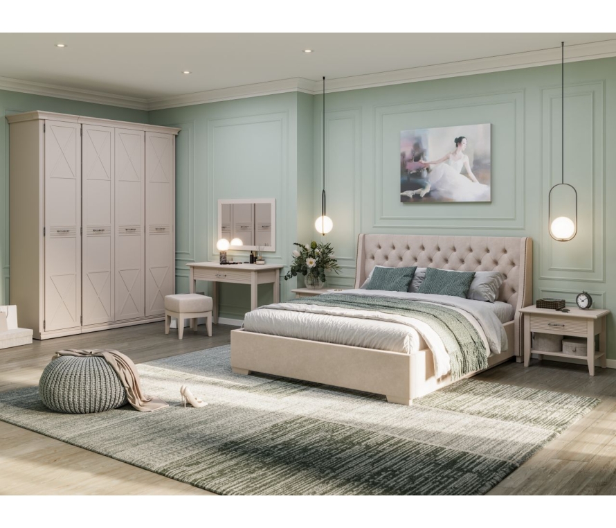 Состав:Кровать Кантри КА-810.26 (160 х 200) — 1 шт;Шкаф Кантри КА-200.24 — 1 шт;Шкаф Кантри КА-210.01 — 2 шт;Тумба прикроватная Кантри КА-300.09 (Я) - 2 шт;Стол туалетный Кантри КА-500.09 — 1 шт;Зеркало Кантри КА-601.01 — 1 шт;Завершающая колонна Кантри КА-015.06 — 2 шт.Особенности:Спальня в классическом стиле. Кантри — одна из любимых коллекций наших клиентов. Такая мебель подойдет к интерьерам в стилях прованс, кантри или сканди. При создании этой коллекции наш дизайнер вдохновлялась самобытной архитектурой Германии с ее характерной фахверковой системой;Спальня будет гармонировать как с яркими оттенками (бирюзовым, горчичным), так и с приглушенными (пастельно-зеленым, пудрово-розовым), а также со всеми оттенками серого;Спальня Кантри понравится тем, кто ценит легкость и ищет для себя актуальную и самобытную классику. Кантри, как европейская архитектура, существует вне моды и легко трансформируется под ваш вкус.Характеристики:Мебель выполнена в цвете «Кашемир Серый»;Вся лицевая фурнитура в коллекции Кантри сделана в стильном оттенке «античное железо»;Опоры тумб и кровати изготовлены из массива бука. Они визуально облегчают пространство и делают комнату более «воздушной»;Шкафы украшены изящными фахверками. Эти декоративные элементы отсылают к Старой Европе и создают дополнительные неброские акценты в интерьере;Вы можете самостоятельно выбрать размер и комплектацию шкафов и кровати;Для хранения в спальне есть большой шкаф. Материалы:Основание кровати — ортопедическое, из березовых ламелей. Осталось лишь выбрать матрас — и спальное место готово!Для спальни используется крепежная фурнитура и механизмы ведущих производителей. Такая фурнитура позволит мебели прослужить дольше, не требуя частого ремонта. Петли оснащены доводчиками для более плавного закрывания дверей;В выдвижных ящиках используются направляющие скрытого монтажа со встроенным доводчиком. Это позволяет легко и почти бесшумно выдвигать-задвигать ящики, а также обеспечивает надежную фиксацию ящика и гарантирует длительный срок службы даже при высокой нагрузке.
