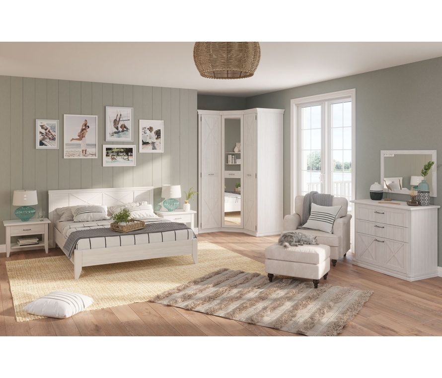 Состав:Кровать Кантри КА-800.26 — 1 шт;Шкаф Кантри КА-230.02 — 1 шт;Шкаф Кантри КА-210.01 — 2 шт;Тумба прикроватная Кантри КА-300.09 — 2 шт;Зеркало Кантри КА-601.01 — 1 шт;Комплект цоколей Кантри КА-014.05 — 1 шт;Карниз Кантри КА-013.03 — 2 шт.Особенности:Спальня в классическом стиле. Кантри — одна из любимых коллекций наших клиентов. Такая мебель подойдет к интерьерам в стилях прованс, кантри или сканди. При создании этой коллекции наш дизайнер вдохновлялась самобытной архитектурой Германии с ее характерной фахверковой системой;Спальня будет гармонировать как с яркими глубокими оттенками (бирюзовым, синим), так и с приглушенными (пастельно-зеленым, пудрово-розовым), а также со всеми оттенками серого;Спальня Кантри понравится тем, кто ценит легкость и ищет для себя актуальную и самобытную классику. Кантри, как европейская архитектура, существует вне моды и легко трансформируется под ваш вкус.Характеристики:Мебель выполнена в цвете «блан шене»;Вся лицевая фурнитура в коллекции Кантри сделана в стильном оттенке «античное железо»;Опоры тумб и кровати изготовлены из массива бука. Они визуально облегчают пространство и делают комнату более «воздушной»;Шкафы, комод и кровать украшены изящными фахверками. Эти декоративные элементы отсылают к Старой Европе и создают дополнительные неброские акценты в интерьере;Вы можете самостоятельно выбрать комплектацию шкафов;Для хранения в спальне есть большой шкаф с зеркалами. Поэтому можно увидеть свой образ сразу после переодевания, не выходя в ванную или коридор.Материалы:Основание кровати — ортопедическое, из березовых ламелей. Осталось лишь выбрать матрас — и спальное место готово!Для спальни используется крепежная фурнитура и механизмы ведущих производителей. Такая фурнитура позволит мебели прослужить дольше, не требуя частого ремонта. Петли оснащены доводчиками для более плавного закрывания дверей;В выдвижных ящиках используются направляющие скрытого монтажа со встроенным доводчиком. Это позволяет легко и почти бесшумно выдвигать-задвигать ящики, а также обеспечивает надежную фиксацию ящика и гарантирует длительный срок службы даже при высокой нагрузке.Классическое оформление спального гарнитура никогда не утратит своей актуальности. Мебельный комплект с традиционным дизайном идеально впишется в стиль кантри, прованс, неоклассика или сканди. Центральное место в помещении займет двуспальная кровать с высоким жестким изголовьем, декорированным накладками-фахверками. Вместительные системы хранения — два шкафа-пенала и угловой шкаф с зеркальным фасадом — помогут рационально организовать пространство и облегчат процесс сборов. Для размещения мелких аксессуаров подойдут прикроватные тумбы. В комплект также входят карнизы, цоколи и обрамленное минималистичной рамой зеркало.Мебель выполнена в оттенке «блан-шене», который прекрасно будет выглядеть на фоне как приглушенного, так и яркого окружения. Фурнитура имеет черное покрытие цвета «античное железо». Рамочные фасады, высокие скошенные ножки, изящные фахверки визуально облегчат корпусные предметы интерьера.