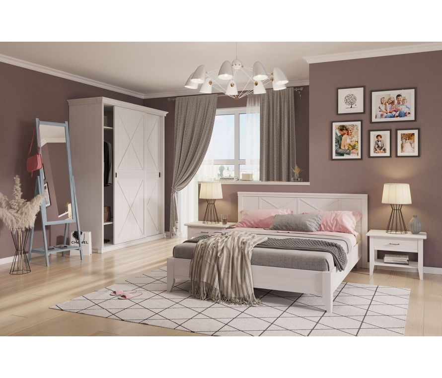 Состав:Кровать Кантри КА-800.26 — 1 шт;Тумба прикроватная Кантри КА-300.09 — 2 шт;Шкаф-купе Кантри КА-183.04 — 1 шт.Особенности:Спальня в классическом стиле. Кантри — одна из любимых коллекций наших клиентов. Такая мебель подойдет к интерьерам в стилях прованс, кантри или сканди. При создании этой коллекции наш дизайнер вдохновлялась самобытной архитектурой Германии с ее характерной фахверковой системой;Спальня будет гармонировать как с яркими глубокими оттенками (бирюзовым, синим), так и с приглушенными (пастельно-зеленым, пудрово-розовым), а также со всеми оттенками серого;Спальня Кантри понравится тем, кто ценит легкость и ищет для себя актуальную и самобытную классику. Кантри, как европейская архитектура, существует вне моды и легко трансформируется под ваш вкус.Характеристики:Мебель выполнена в цвете «блан шене»;Вся лицевая фурнитура в коллекции Кантри сделана в стильном оттенке «античное железо»;Опоры тумб и кровати изготовлены из массива бука. Они визуально облегчают пространство и делают комнату более «воздушной»;Шкафы, комод и кровать украшены изящными фахверками. Эти декоративные элементы отсылают к Старой Европе и создают дополнительные неброские акценты в интерьере;Вы можете самостоятельно выбрать комплектацию шкафов;Для хранения в спальне есть большой шкаф с зеркалами. Поэтому можно увидеть свой образ сразу после переодевания, не выходя в ванную или коридор.Материалы:Основание кровати — ортопедическое, из березовых ламелей. Осталось лишь выбрать матрас — и спальное место готово!Для спальни используется крепежная фурнитура и механизмы ведущих производителей. Такая фурнитура позволит мебели прослужить дольше, не требуя частого ремонта. Петли оснащены доводчиками для более плавного закрывания дверей;В выдвижных ящиках используются направляющие скрытого монтажа со встроенным доводчиком. Это позволяет легко и почти бесшумно выдвигать-задвигать ящики, а также обеспечивает надежную фиксацию ящика и гарантирует длительный срок службы даже при высокой нагрузке.К этой мебели подойдут аксессуары в стиле неоклассика, ковры в стиле пэчворк, плетеные пуфы и вязанные пледы. Если вы хотите добавить акцентов в спальню — используйте стулья и кресла ярких оттенков, для более «спокойного» интерьера — выбирайте приглушенные тона. Не забудьте про туалетный столик, который сделает утренние и вечерние ритуалы еще приятнее.