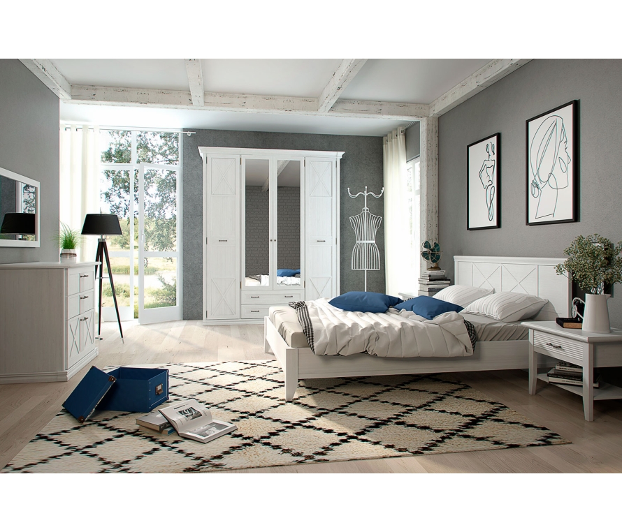 Состав:Кровать Кантри КА-800.26 — 1 шт;Зеркало Кантри КА-601.01 — 1 шт;Карниз Кантри КА-013.03 — 2 шт;Комплект цоколей Кантри КА-014.05 — 1 шт;Комод Кантри КА-101.11 — 1 шт;Шкаф Кантри КА-200.04 — 1 шт;Шкаф Кантри КА-210.01 — 2 шт;Тумба прикроватная Кантри КА-300.09 — 2 шт.Особенности:Спальня в классическом стиле. Кантри — одна из любимых коллекций наших клиентов. Такая мебель подойдет к интерьерам в стилях прованс, кантри или сканди. При создании этой коллекции наш дизайнер вдохновлялась самобытной архитектурой Германии с ее характерной фахверковой системой;Спальня будет гармонировать как с яркими оттенками (бирюзовым, горчичным), так и с приглушенными (пастельно-зеленым, пудрово-розовым), а также со всеми оттенками серого;Спальня Кантри понравится тем, кто ценит легкость и ищет для себя актуальную и самобытную классику. Кантри, как европейская архитектура, существует вне моды и легко трансформируется под ваш вкус.Характеристики:Мебель выполнена в цвете «блан шене»;Вся лицевая фурнитура в коллекции Кантри сделана в стильном оттенке «античная бронза»;Опоры тумб и кровати изготовлены из массива бука. Они визуально облегчают пространство и делают комнату более «воздушной»;Шкафы, комод и кровать украшены изящными фахверками. Эти декоративные элементы отсылают к Старой Европе и создают дополнительные неброские акценты в интерьере;Вы можете самостоятельно выбрать размер и комплектацию шкафов и кровати;Для хранения в спальне есть большой шкаф с двумя зеркалами. Поэтому можно увидеть свой образ сразу после переодевания, не выходя в ванную или коридор.Материалы:Основание кровати — ортопедическое, из березовых ламелей. Осталось лишь выбрать матрас — и спальное место готово!Для спальни используется крепежная фурнитура и механизмы ведущих производителей. Такая фурнитура позволит мебели прослужить дольше, не требуя частого ремонта. Петли оснащены доводчиками для более плавного закрывания дверей;В выдвижных ящиках используются направляющие скрытого монтажа со встроенным доводчиком. Это позволяет легко и почти бесшумно выдвигать-задвигать ящики, а также обеспечивает надежную фиксацию ящика и гарантирует длительный срок службы даже при высокой нагрузке.К этой мебели подойдут аксессуары в стиле неоклассика, ковры с винтажным потертым рисунком, плетеные пуфы и вязанные пледы. Если вы хотите добавить акцентов в интерьер — используйте стулья и кресла ярких оттенков, для более «спокойного» интерьера — выбирайте приглушенные тона. Не забудьте про туалетный столик, который сделает утренние и вечерние ритуалы еще приятнее.