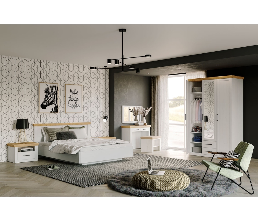 Состав:Кровать Магнум МГ-800.26 — 1 шт;Тумба прикроватная Магнум МГ-305.02 — 2 шт;Шкаф для одежды Магнум МГ-172.03 — 1 шт;Туалетный стол Магнум МГ-500.09 - 1 шт.;Зеркало настенное Магнум МГ-601.01 - 1 шт.;Банкетка Магнум МГ-910.01 - 1 шт.Особенности:Спальня в традиционном стиле. Такая мебель универсальна и подойдет интерьерам в стилях скандинавский, эко, фьюжн, легкий лофт. Мебель из коллекции Магнум легко подстроится под уже имеющийся интерьер или может стать основой для нового;Спальня будет гармонировать как с классическими оттенками белого, серого, коричневого, так и с текстурами — деревом, бетоном и кирпичом;Коллекция Магнум понравится тем, кто ищет мебель, актуальную «на века». Такая мебель создает уют и спокойствие — светлые оттенки и текстура дерева отсылают к беззаботному детству.Характеристики:Мебель выполнена в цветах «блан шене» и «дуб бунратти»;Все ручки в коллекции Магнум сделаны в стильном оттенке «железо античное черное»;Основание кровати — ортопедическое. Матрас приобретается отдельно.Материалы:Каркасы выполнены из ЛДСП, фасады — МДФ профиль, окутанный бумагой с «финиш-эффектом»;Для спальни используется крепежная фурнитура и механизмы ведущих производителей;Петли оснащены демпфером для плавного закрывания дверей. Такая фурнитура позволит мебели прослужить дольше, не требуя частого ремонта;В выдвижных ящиках используется система скрытых направляющих со встроенным демпфером. Это позволяет легко и почти бесшумно выдвигать-задвигать ящики, а также обеспечивает надежную фиксацию ящика и гарантирует длительный срок службы даже при высокой нагрузке.В зависимости от стиля, который вы хотите создать в вашем доме, можно дополнительно приобрести минималистичные вазы для цветов — для эко или скандинавского стилей, аксессуары из темного металла и стекла — для лофта, яркое акцентное кресло или пуф — для фьюжна.