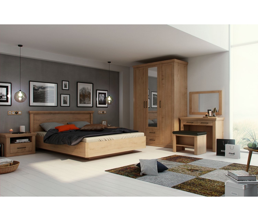 Состав:Кровать Магнум МГ-800.26 — 1 шт;Тумба прикроватная Магнум МГ-305.02 — 2 шт;Шкаф для одежды Магнум МГ-172.03 — 1 шт.Особенности:Мебель универсальна и подойдет интерьерам в стилях лофт, скандинавский, фьюжн, эко. Мебель из коллекции Магнум легко подстроится под уже имеющийся интерьер или может стать основой для нового;Спальня будет гармонировать как с классическими оттенками белого, серого, коричневого, так и с текстурами — деревом, бетоном и кирпичом;Коллекция Магнум подойдет тем, кто ищет мебель, актуальную «на века». Такая спальня станет отличной покупкой для молодых людей и пар, которые только обустраивают свое жилье и пока окончательно не определились со стилем. Магнум может легко трансформироваться вместе со вкусами владельца: сегодня — лофт, завтра — минимализм, послезавтра — эко.Характеристики:Корпус мебели и фасады выполнены в цвете «дуб бунратти»;Все ручки в коллекции Магнум сделаны в стильном оттенке «железо античное черное»;Для хранения в спальне есть большой шкаф с зеркалом. Благодаря этому вы можете увидеть свой образ сразу после переодевания, не выходя в ванную или коридор;Основание кровати — ортопедическое. Матрас приобретается отдельно.Материалы:Для спальни используется крепежная фурнитура и механизмы ведущих производителей;Петли со встроенным демпфером позволяют плавно закрывать двери. Такая фурнитура позволит мебели прослужить дольше, не требуя частого ремонта;В выдвижных ящиках используется система скрытых направляющих со встроенным демпфером. Это позволяет легко и почти бесшумно выдвигать-задвигать ящики, а также обеспечивает надежную фиксацию ящика и гарантирует длительный срок службы даже при высокой нагрузке.В зависимости от стиля, который вы хотите создать в вашем доме, можно дополнительно приобрести минималистичные вазы для цветов — для эко или скандинавского стилей, аксессуары из темного металла и стекла — для лофта, яркое акцентное кресло или пуф — для фьюжена.
