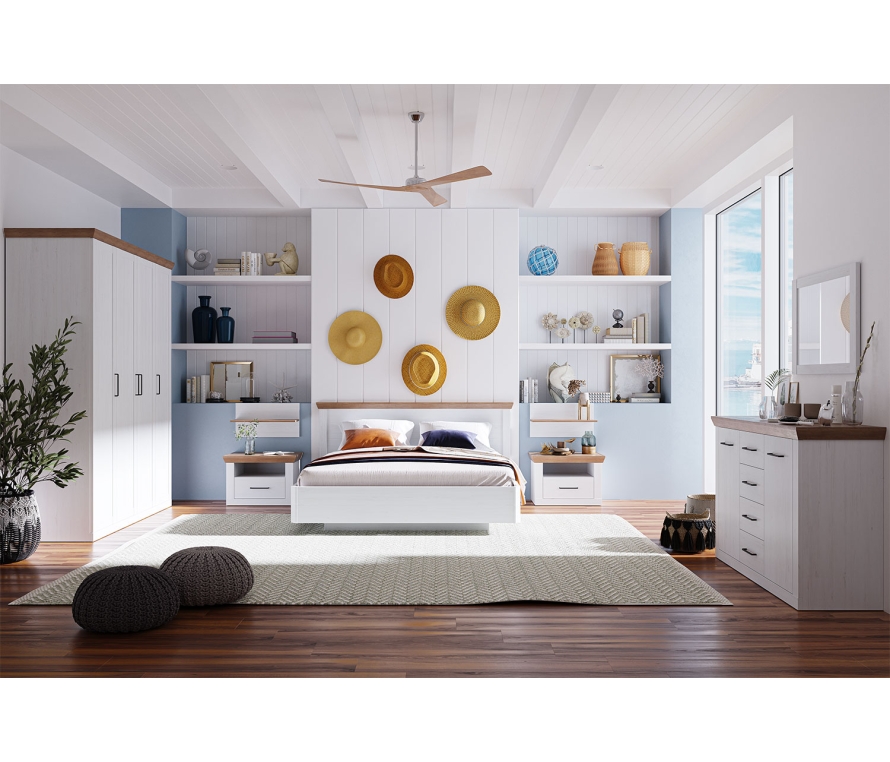 Состав:Кровать Магнум МГ-800.26 — 1 шт;Шкаф для одежды Магнум МГ-183.01 — 1 шт;Комод Магнум МГ-104.01 — 1 шт;Тумба прикроватная Магнум МГ-305.02 — 2 шт;Полка настенная Магнум МГ-021.01 — 2 шт;Зеркало настенное Магнум МГ-601.01 — 1 шт.Особенности:Спальня в традиционном стиле. Такая мебель универсальна и подойдет интерьерам в стилях скандинавский, эко, фьюжн, легкий лофт. Мебель из коллекции Магнум легко подстроится под уже имеющийся интерьер или может стать основой для нового;Спальня будет гармонировать как с классическими оттенками белого, серого, коричневого, так и с текстурами — деревом, бетоном и кирпичом;Коллекция Магнум понравится тем, кто ищет мебель, актуальную «на века». Такая мебель создает уют и спокойствие — светлые оттенки и текстура дерева отсылают к беззаботному детству.Характеристики:Мебель выполнена в цветах «блан шене» и «дуб бунратти»;Все ручки в коллекции Магнум сделаны в стильном оттенке «железо античное черное»;Основание кровати — ортопедическое. Матрас приобретается отдельно.Материалы:Каркасы выполнены из ЛДСП, фасады — МДФ профиль, окутанный бумагой с «финиш-эффектом»;Для спальни используется крепежная фурнитура и механизмы ведущих производителей;Петли оснащены демпфером для плавного закрывания дверей. Такая фурнитура позволит мебели прослужить дольше, не требуя частого ремонта;В выдвижных ящиках используется система скрытых направляющих со встроенным демпфером. Это позволяет легко и почти бесшумно выдвигать-задвигать ящики, а также обеспечивает надежную фиксацию ящика и гарантирует длительный срок службы даже при высокой нагрузке.В зависимости от стиля, который вы хотите создать в вашем доме, можно дополнительно приобрести минималистичные вазы для цветов — для эко или скандинавского стилей, аксессуары из темного металла и стекла — для лофта, яркое акцентное кресло или пуф — для фьюжна.