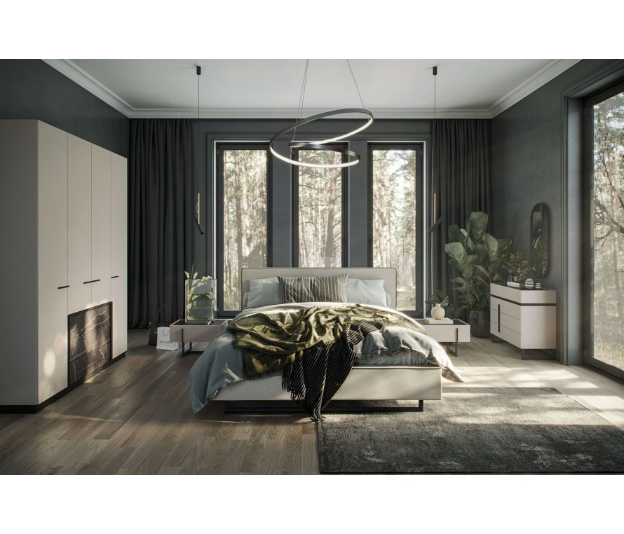 Состав:Кровать Малага 160 х 200 см — 1 шт.;Шкаф Милагро МИ-201.04 — 1 шт.;Шкаф Милагро МИ-211.01 — 2 шт.;Прикроватная тумба Милагро МИ-300.10 — 2 шт.Характеристики:Каркасы и фасады из ЛДСтП 16 мм в цвете Кашемир серый;Темные вставки на ящиках шкафа, столешницы тумб и комодов из ЛДСтП 16 мм черного цвета с имитацией рисунка мрамора;Корпус выдвижных ящиков с фасадами Кашемир серый выполнен из ЛДСтП 16 мм в цвете Кашемир серый, а с фасадами под черный мрамор — в цвете Черный графит;Шкафы можно комплектовать дополнительными полками;Максимальная нагрузка на ящики – не более 6 кг;Петли Sensys в цвете черный обсидиан с доводчиком;Направляющие на ящиках скрытого монтажа Слорос с доводчиком;Кровать мягкая, спальное место 160 х 200 см, без подъемного механизма;Материал обивки кровати — микровелюр.Милагро — стиль и элегантность в каждой детали.Коллекция в стиле минимализм с элементами изящных линий лицевой фурнитуры и акцентами черного мрамора. Олицетворяет собой простоту и элегантность. Элементы этой коллекции были тщательно разработаны, чтобы создать гармоничный образ Вашего интерьера, где важны не только функциональность и практичность, но и эстетика.Серый цвет фасадов придает коллекции сдержанность и спокойствие, а черный мрамор добавляет изысканности и роскоши. Мебель из этой коллекции выполнена из высококачественных материалов, что гарантирует ее долговечность и надежность.Она идеально подойдет для тех, кто ценит простоту, элегантность и функциональность. Каждый предмет мебели в этой коллекции создан с использованием высококачественных материалов и тщательно продуманных деталей.Все модули гармонично сочетаются друг с другом. Черный акцентный мрамор добавляет коллекции изысканности и роскоши, а выразительная геометрия тонких черных ручек на фасадах, перетекающая в линию опор, придают ей современный вид.
