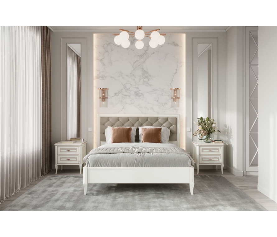 Состав:Кровать Онтарио ОН-800.26 — 1 шт;Мягкий элемент Онтарио ОН-900.26 — 1 шт;Тумба Онтарио ОН-306.04 — 2 шт.Особенности:Спальня в классическом стиле. Такая мебель подойдет к интерьерам в стиле неоклассика, контемпорари, эклектика. При создании этой коллекции наши дизайнеры вдохновлялись романтичной атмосферой и элегантностью Санкт-Петербурга;Спальня будет гармонировать с кремовыми светлыми оттенками пастельной гаммы, а естественный свет и разнообразные фактуры придадут ей особый шик. Мрамор, шелк, велюр — выбирайте эти благородные материалы для декора спальни, чтобы сделать интерьер еще более утонченным и изящным;Коллекция Онтарио понравится как заядлым поклонникам классики, так и простым романтичным натурам, у которых в душе всегда Париж и Санкт-Петербург.Характеристики:Мебель выполнена в цвете «бело-серый»;На фасады вручную нанесена металлизированная патина в цвет ручек;Изголовье кровати декорировано «каретной стяжкой» и украшено пуговицами;Размер спального места: 160 х 200 см. Матрас приобретается отдельно.Материалы:Опоры тумб выполнены из массива бука с эффектом протирания. Это придает мебели антикварный вид;Обивка мягкого изголовья кровати: микровелюр Bella 03;Спальное место — ортопедическая решетка, состоящая из металлического каркаса и гнуто-клееных лат, которая изготовлена в соответствии с требованиями ГОСТ;Для спальни используется крепежная фурнитура и механизмы ведущих производителей Titus, Hettich. Такая фурнитура позволит мебели прослужить дольше, не требуя частого ремонта;В выдвижных ящиках используется система скрытых направляющих Quadro (Hettich, Германия) с функцией демпфирования. Это позволяет легко и почти бесшумно выдвигать-задвигать ящики, а также обеспечивает надежную фиксацию ящика и гарантирует длительный срок службы даже при высокой нагрузке.