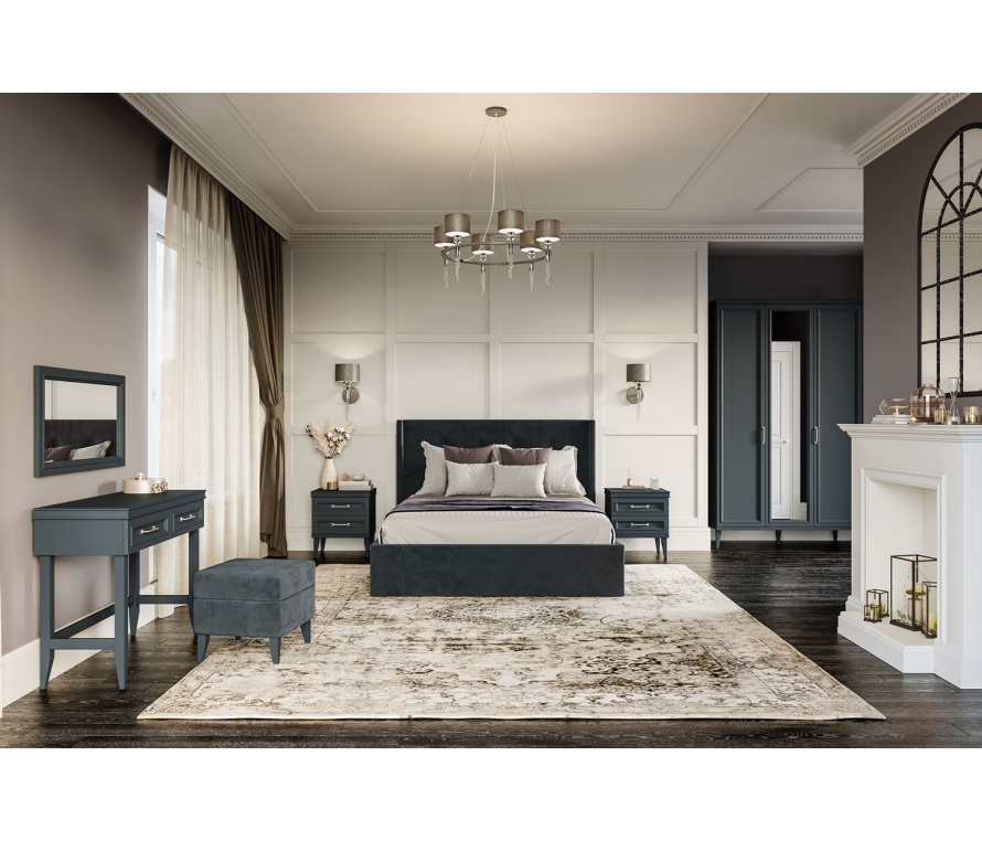 Состав:Тумба прикроватная Орландо ОР-306.04 — 2 шт;Шкаф для одежды Орландо ОР-177.03 — 1 шт;Кровать Орландо ОР-810.26 — 1 шт;Зеркало настенное Орландо ОР-601.01 — 1 шт;Пуф Орландо ОР-910.01 — 1 шт;Стол туалетный Орландо ОР-500.09 — 1 шт.Характеристики:Цвет: серый уголь;Шкаф трёхстворчатый с двумя отделениями: в узком отделении — пять полок, в широком отделении — две полки и штанга для одежды;Максимальная нагрузка на полку шкафа — не более 4-6 кг;В выдвижные ящики необходимо класть не более 5-7 кг, при этом нагрузка должна быть распределена по всему дну (не класть тяжелые предметы, которые могут повредить и выдавить дно);Детали кровати обтянуты тканью Avelina (9852), изголовье декорировано пуговицами;Размер спального места: 160 х 200 см;Пуф: обивка — микровелюр Avelina (9852), декорирован пуговицами;Тумбы и шкаф необходимо крепить к стене.Материалы:Корпуса: ЛДСП;Фасады: рамочной конструкции из профиля МДФ, окутанного бумагой с «финиш-эффектом», в «глухих» фасадах — вставки из ЛМДФ 0,6 см, в зеркальном фасаде — вставка зеркало 0,4 см;Для облицовывания кромок деталей используется высококачественный материал от ключевых производителей;Опоры: массив бука;Мягкий каркас пуфа выполнен из пенополиуретана (ППУ — поролон), синтепона и спанбонда;Крепежная фурнитура и механизмы ведущих производителей;В выдвижных ящиках используются направляющие скрытого монтажа со встроенным доводчиком.