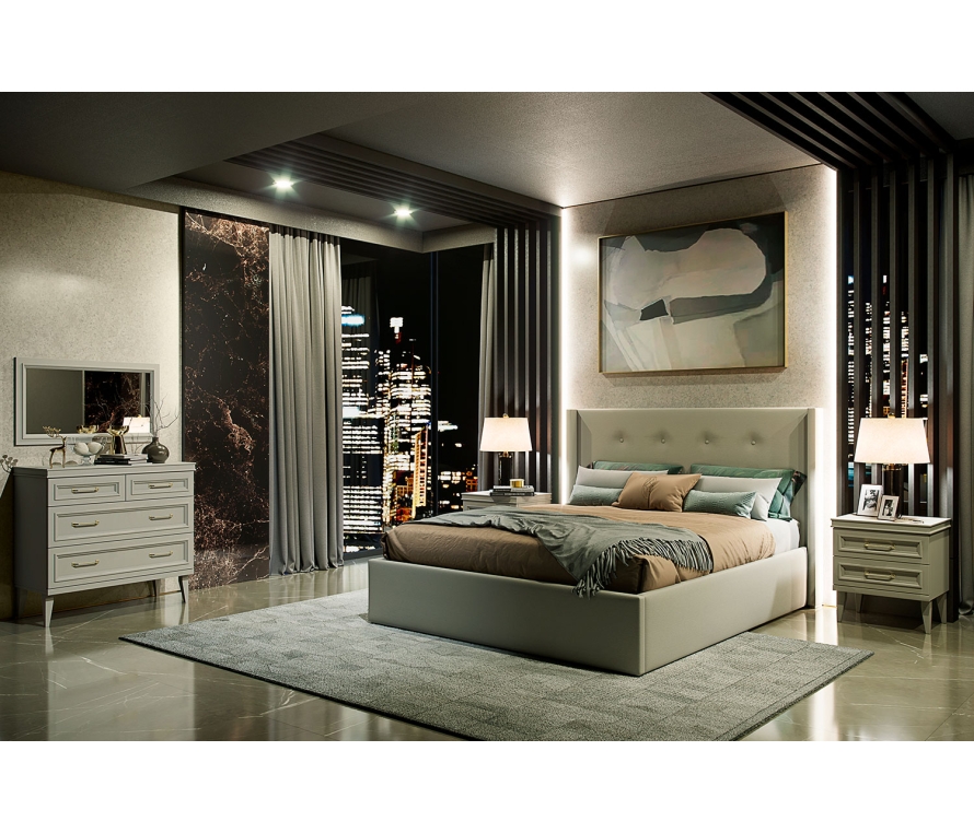 Состав:Кровать Орландо ОР-810.26 — 1 шт;Тумба прикроватная Орландо ОР-306.04 — 2 шт.Характеристики:Цвет: ярко-серый;Комод с 4 выдвижными ящиками. Максимальная распределенная нагрузка для выдвижных ящиков на дно — 4-7 кг (на верхние ящики — не более 4 кг);Детали кровати обтянуты тканью Avelina (9534), изголовье декорировано пуговицами;Размер спального места: 160 х 200 см;Тумбы и шкаф необходимо крепить к стене.Материалы:Корпуса: ЛДСП;Фасады: рамочной конструкции, вставки из ЛМДФ 6 мм;Для облицовывания кромок деталей используется высококачественный материал от ключевых производителей;Опоры: массив бука;Крепежная фурнитура и механизмы ведущих производителей;В выдвижных ящиках используются направляющие скрытого монтажа со встроенным доводчиком.