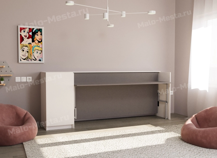 Кровать-трансформер Avorio для детской имеет самый нестандартный механизм трансформации в линейке Kids Size ТМ "Мало места". В комплект входит трансформируемая горизонтальная кровать, шкаф для нее, рабочий стол школьника и тумба для хранения сбоку от шкафа.В основе кровати стальная рама основания для ортопедического матраса и стальные детали механизма трансформации.Опора кровати – 2 металлических ножки, которые необходимо повернуть перпендикулярно кровати в процессе раскладывания. Открытие кровати осуществляется за фасадную часть откидной кровати. Стол в процессе трансформации остается в горизонтальном положении и сохраняет все лежащие на нем вещи в исходном состоянии. Во время трансформации стол "уходит" наверх и фиксируется в верхней точке.Шкаф для кровати имеет заднюю стенку. Тумба для хранения размещается сбоку от шкафа для кровати. Конструкция тумбы может быть выполнена любая (закрытые полки, выкатные ящики). Стороны размещения тумбы можно выбрать во время оформления заказа. Есть возможность заказать Avorio без тумбы.