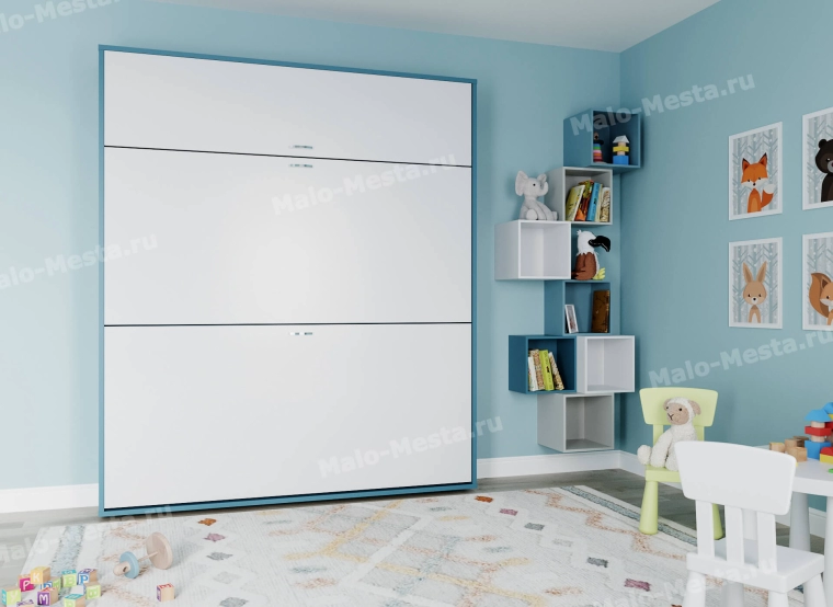 Двухъярусная кровать-трансформер для двоих детей Duos включает в себя две откидные кровати, размещенные одна над другой и единый шкаф для них.Основа кровати-трансформера – стальные рамы оснований для ортопедических матрасов, стальные элементы механизма трансформации.На нижнюю кровать устанавливается перекидная стальная опора, кровать открывается за ручку на фасаде.Верхняя откидная кровать открывается также за ручку на фасаде и фиксируется с помощью металлической лестницы, благодаря которой можно попасть на вторую кровать. На втором ярусе установлены металлические складные бортики по кругу.Нижняя кровать имеет один металлический складной бортик в качестве изголовья. Кроме того, можно заказать установку дополнительных защитных бортиков для нижней кровати.Шкаф подъемной кровати Duos имеет заднюю стенку. В верхней части шкафа есть закрытая антресоль, которая открывается ручкой на фасаде.