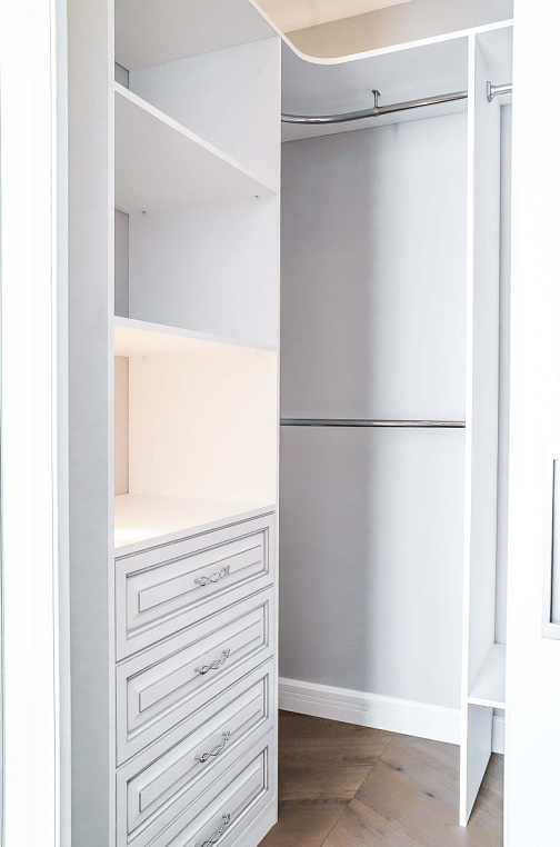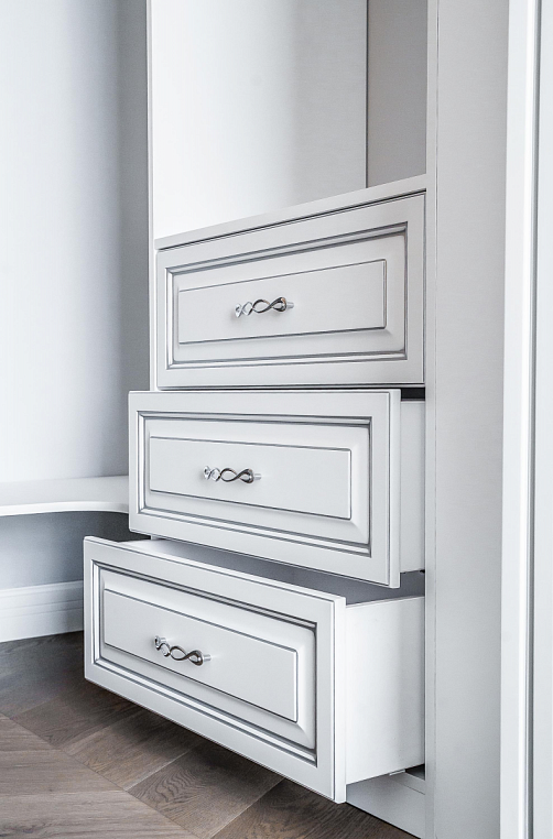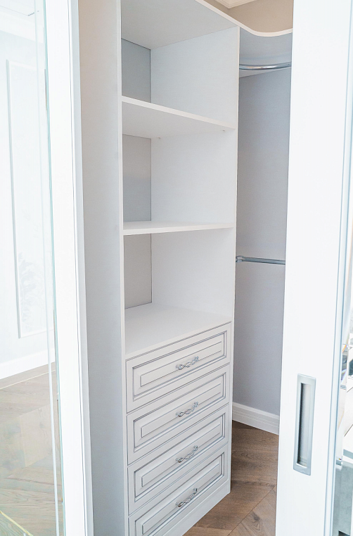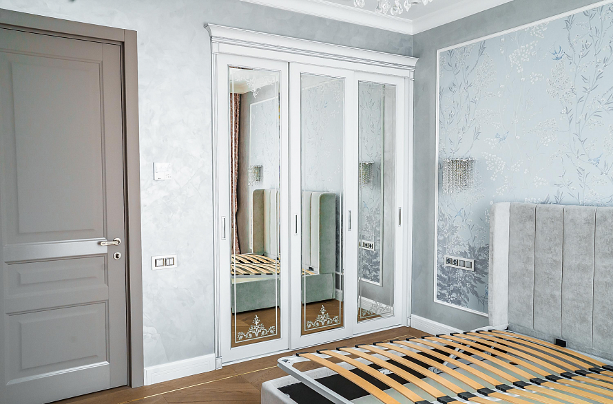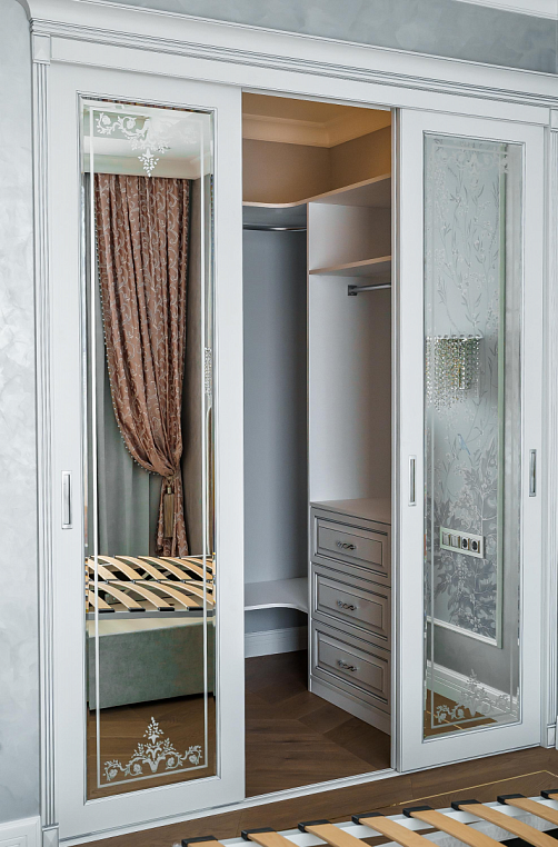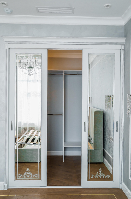 Гардеробная с классическими фасадами из МДФ, которые декорированы патиной Серебро. Двери-купе из МДФ, а в качестве наполнения выбрано зеркало Серебро с пескоструйным рисунком и врезные ручки. Пескорстуйный рисунок придает изделию еще большей индивидуальности. С помощью пескоструйной обработки можно реализовать самые смелые идеи на зеркале или стекле. Посмотреть весь реализованный проект