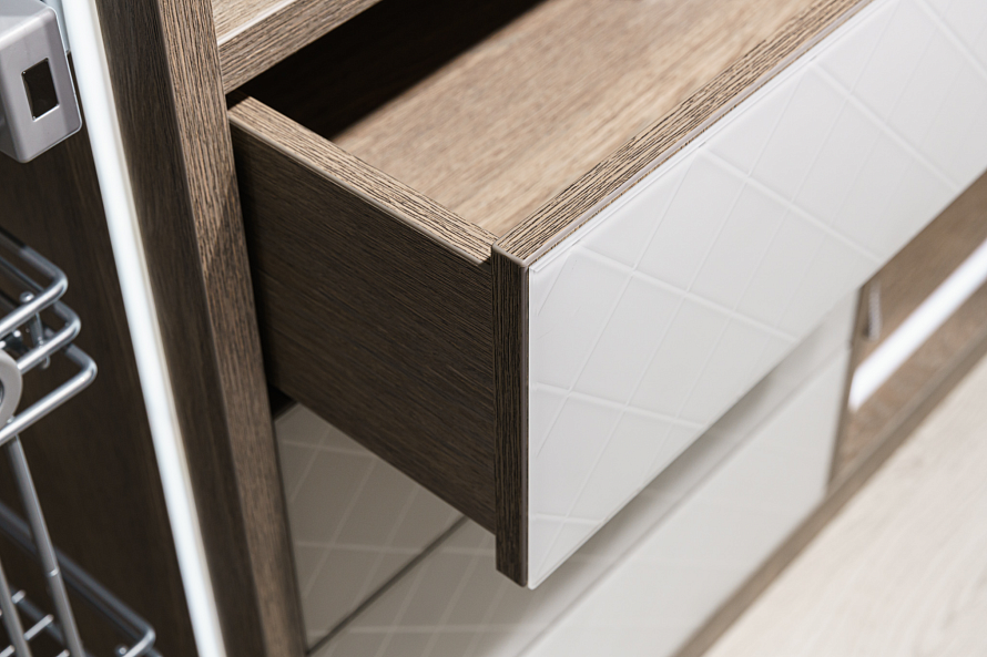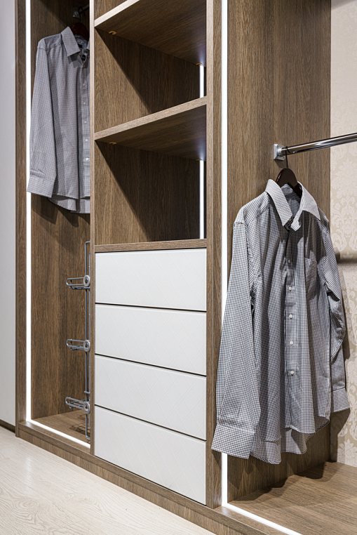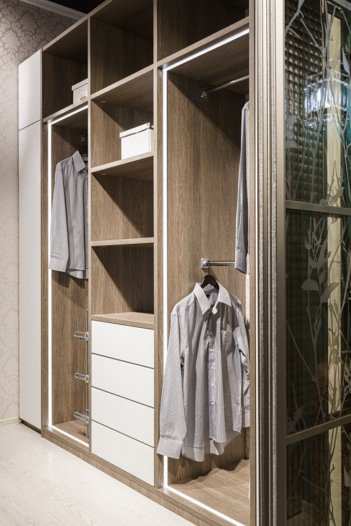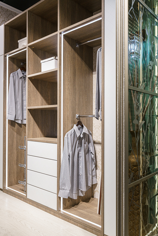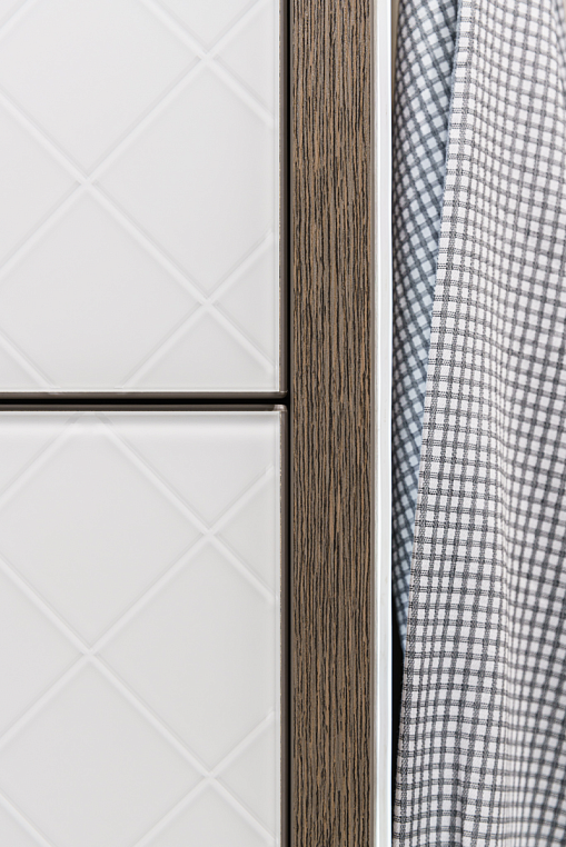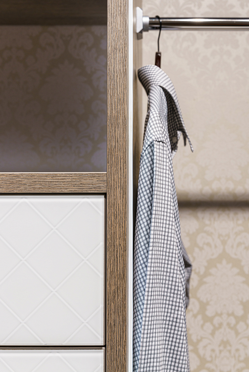 Фасад изделия выполнен из ЛДСП Эггер H1115ST12 Баменда серо-бежевый + стекло Лакобель 9003, пескоструйный рисунок "клетка 50*50" Корпус изделия - ЛДСП Эггер H1115ST12 Баменда серо-бежевый 16 мм и ЛДСП Эггер H1115ST12 Баменда серо-бежевый 25 мм Внутреннее наполнение - ящики, полки, светодиодная подсветка У каждого есть свое представление об идеальной гардеробной, ее функционале и внешнем виде. Использование индивидуальной мебели позволяет создать именно тот проект, который впишется в ваш интерьер и будет выполнять нужные вам функции. В ленте представлена гардеробная от #lakoner. Фасад изделия выполнен с использованием ЛДСП Egger серо-бежевого цвета и стекла Lacobel. Отличительной особенностью гардеробной является подсветка,установленная по периметру зон хранения одежды. Наличие подсветки не только создает визуальный акцент на изделие, но и помогает при приглушенном освещении выбирать одежду.