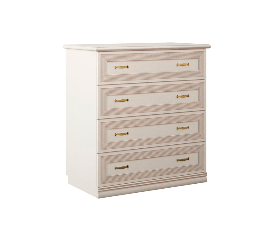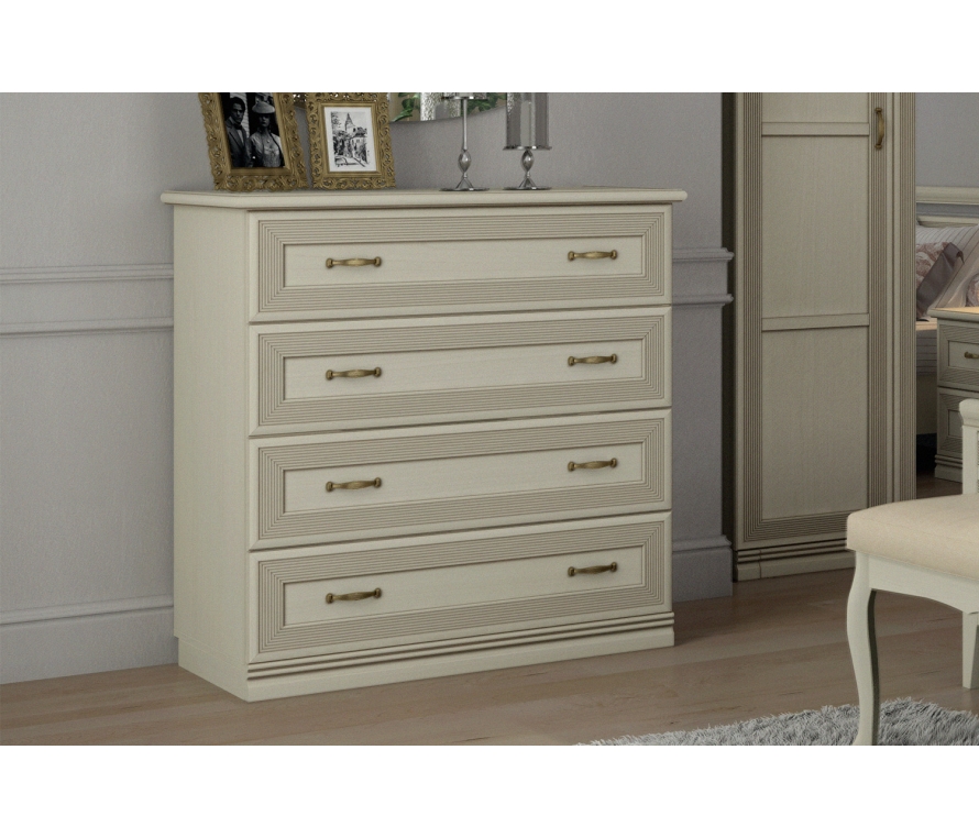 Особенности коллекции:Cпальня «Адажио» выполнена в стиле традиционной итальянской классики с элементами современности. О том, что это именно классика, нам говорят строгие прямые карнизы, придающие спальне законченность и шарм, красивый резной цоколь, который изысканно закрывает опоры и, безусловно, нежный цвет «валенсия», который делает спальню легкой и воздушной;«Адажио» поможет создать в спальне спокойную, гармоничную, уютную атмосферу — именно то, что нужно для полноценного отдыха после напряженного дня и восстановления сил;На фасады нанесена патина, которая создает визуальный эффект состаренного дерева и добавляет гарнитуру роскоши. Поверх патины фасады покрыты акриловым лаком, который отличается повышенной атмосферо- и светостойкостью, покрытие со временем не желтеет.Характеристики:Цвет: валенсия;Комод с 4 выдвижными ящиками;Комод нужно использовать по назначению, не допускать установки тяжелых предметов на верхнюю крышку. Максимальная распределенная нагрузка на верхнюю крышку — не более 8 кг;В выдвижной ящик можно класть не более 5-7 кг, при этом нагрузка должна быть распределена по всему дну (не класть тяжелые предметы, которые могут повредить и выдавить дно);На столешнице по видимой части выполнен декоративный профиль;Есть спил под плинтус;Необходимо крепление комода к стене во избежание опрокидывания при выдвижении ящиков.Материалы:Корпус: ЛДСП;Фасады: ЛДСП с наклеенным профилем из МДФ;Каркас ящиков выполнен из ящичного профиля;Профиль покрыт лаком и патиной (эффект состаренного дерева);Внешняя фурнитура: латунь (под цвет «старая бронза»);Крепежная фурнитура и механизмы: Titus, Hettich;В выдвижных ящиках используется система скрытых направляющих Quadro (Hettich, Германия) с функцией «Silent System» (встроенный доводчик).
