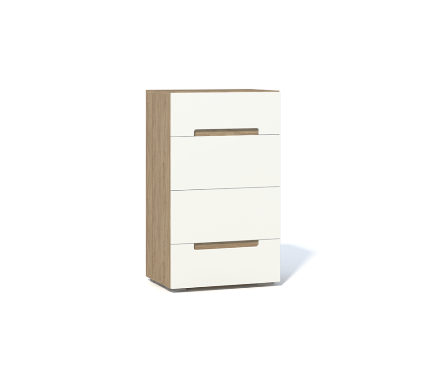 Характеристики:Цвет: швейцарский вяз, белый матовый;Комод с 4 выдвижными ящиками;В выдвижных ящиках используются направляющие скрытого монтажа со встроенным доводчиком;Максимальная распределенная нагрузка для выдвижных ящиков — 8-10 кг;Нагрузка на верхнюю крышку комода не должна превышать 12 кг;Cкрытая эргономичная ручка, выполненная посредством фрезеровки фасада;Необходимо крепление к стене во избежание опрокидывания при выдвижении ящиков (в фурнитуре для этого есть крепежный уголок).Материалы:Каркас: ЛДСП 16 мм и 22 мм;Фасады выполнены из МДФ толщиной 19 мм в пленке ПВХ