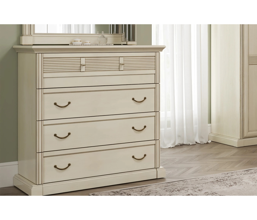 Характеристики:Комод в цвете «валенсия»;Фасад рамочный в цвете «валенсия»;Комод с четырьмя вместительными ящиками на квадронаправляющих;Нет спила под плинтус.Материал:Корпус выполнен из ЛДСП;Широкая крышка за счет профиля из МДФ;На фасады вручную нанесена патина, поверх патины — два слоя испанского лака, что обеспечивает идеальную гладкость и благородный блеск;Крышки выпускаются с неполным покрытием ЛКМ;Внешняя фурнитура — латунь (в цвет античной бронзы).