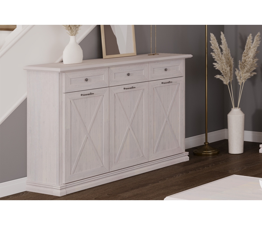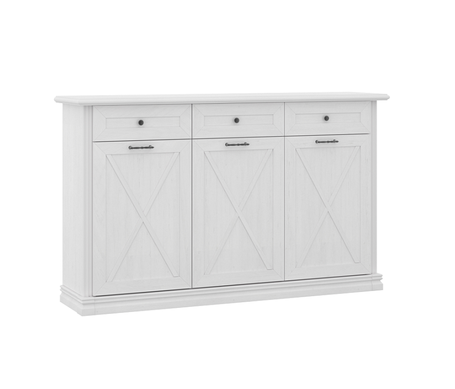 Характеристики:Цвет: блан шене;Цвет фурнитуры: античное железо;Отличительная особенность спальни — наличие декоративных элементов (фахверков), которые визуально подчеркивают стиль и органично его дополняют;Средняя дверь всегда открывается вправо;Максимальная распределенная нагрузка для выдвижных ящиков на дно — 7-8 кг;Необходимо крепление к стене во избежание опрокидывания после выдвижения ящиков;Максимальная распределенная нагрузка на верхнюю крышку — 10-15 кг, тяжелые предметы необходимо ставить над перегородками, чтобы нагрузка передавалась на пол и не прогибалась крышка.Материалы:Каркас ЛДСП 16 мм;Фасады рамочной конструкции из МДФ профиля, в фасадах вставки из ЛДСП 6 мм;Регулируемые металлические опоры высотой 64 мм скрыты декоративным цоколем из профиля МДФ;В выдвижных ящиках используются направляющие скрытого монтажа со встроенным доводчиком.