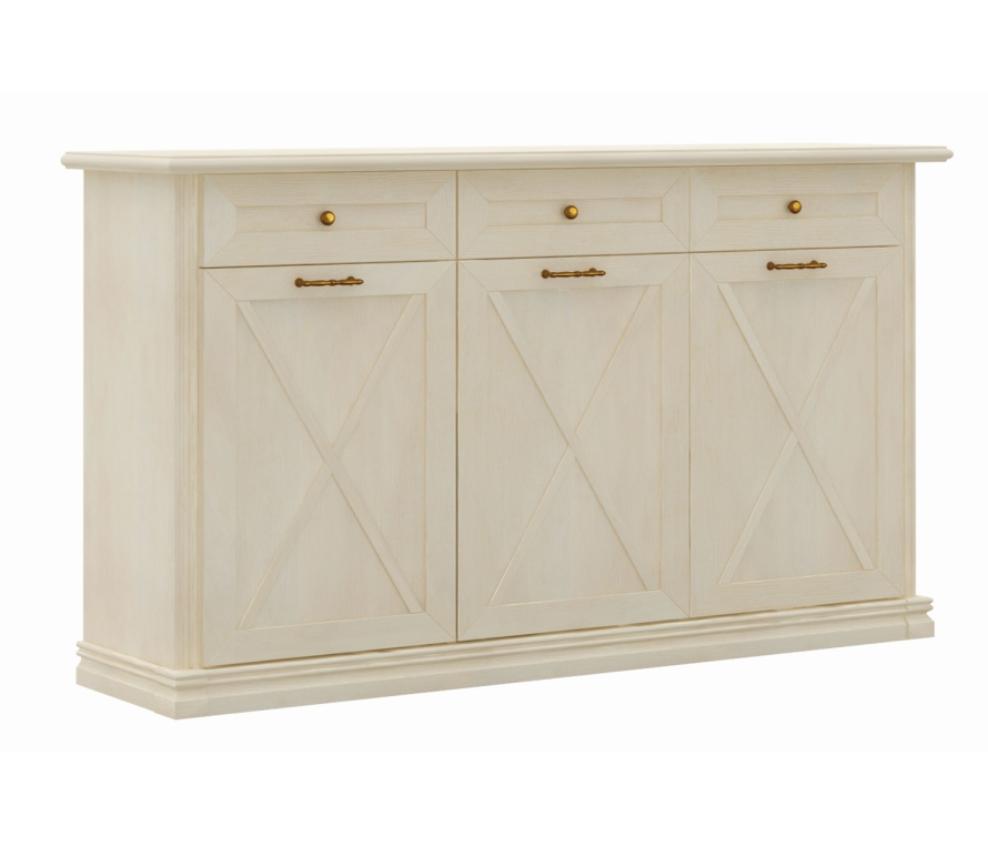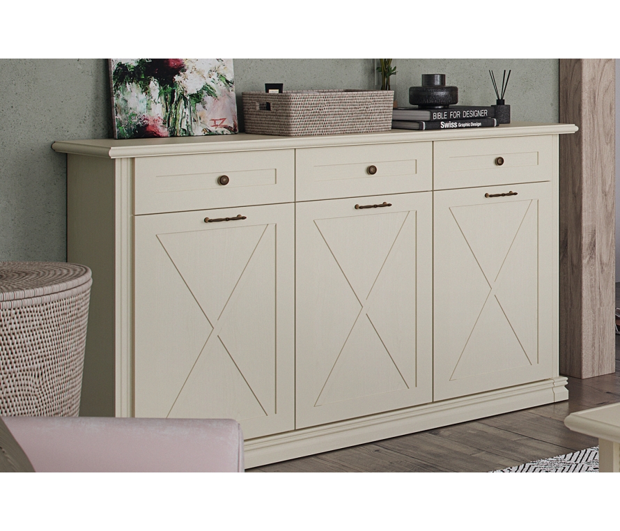 Характеристики:Цвет: валенсия;Цвет фурнитуры: античная бронза;Отличительная особенность спальни — наличие декоративных элементов (фахверков), которые визуально подчеркивают стиль и органично его дополняют;Средняя дверь всегда открывается вправо;Максимальная распределенная нагрузка для выдвижных ящиков на дно — 7-8 кг;Необходимо крепление к стене во избежание опрокидывания после выдвижения ящиков;Максимальная распределенная нагрузка на верхнюю крышку — 10-15 кг, тяжелые предметы необходимо ставить над перегородками, чтобы нагрузка передавалась на пол и не прогибалась крышка.Материалы:Каркас ЛДСП 16 мм;Фасады рамочной конструкции из МДФ профиля, в фасадах вставки из ЛДСП 6 мм;Ящичный профиль ДСП 16 мм окутан в финиш-пленку со структурой льна;Регулируемые металлические опоры высотой 64 мм скрыты декоративным цоколем из профиля МДФ;В выдвижных ящиках используются направляющие скрытого монтажа со встроенным доводчиком.