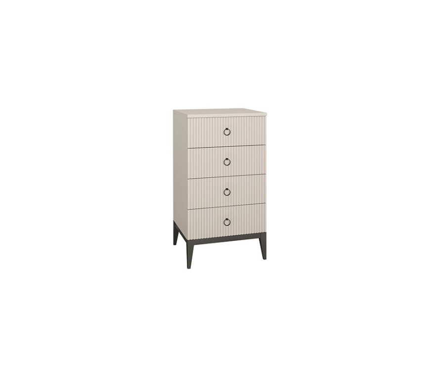 Характеристики:Цвет: кашемир серый;Цвет ручек: чёрный матовый;Комод рекомендуется крепить к стене во избежание опрокидывания;Комод можно заказать в цвете «белый премиум».Материалы:Каркас: ЛДСП 1,6 см, крышка 2,2 см;Фасады ящиков: МДФ с декоративной фрезеровкой в виде вертикальных полос и окутаны плёнкой ПВХ;Ручки: металл, тип «Серьга»;Комод установлен на нерегулируемых по высоте буковых опорах, отделка — серая матовая эмаль;Ящики на выдвижных механизмах скрытого монтажа;Установлены доводчики.