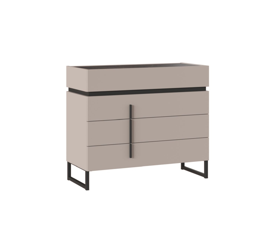 Характеристики:Комод с 4 выдвижными ящиками;Максимальная нагрузка на ящик — не более 6 кг;Каркасы и фасады из ЛДСП 16 мм в цвете «кашемир серый»;Столешница из ЛДСП 16 мм черного цвета с имитацией рисунка мрамора;Опоры из металлического профиля черного цвета, сечение 20 х 20 мм;Направляющие на ящиках скрытого монтажа Слорос с доводчиком.Милагро — стиль и элегантность в каждой детали.Коллекция в стиле минимализм с элементами изящных линий лицевой фурнитуры и акцентами черного мрамора. Олицетворяет собой простоту и элегантность. Элементы этой коллекции были тщательно разработаны, чтобы создать гармоничный образ Вашего интерьера, где важны не только функциональность и практичность, но и эстетика.Серый цвет фасадов придает коллекции сдержанность и спокойствие, а черный мрамор добавляет изысканности и роскоши. Мебель из этой коллекции выполнена из высококачественных материалов, что гарантирует ее долговечность и надежность.Она идеально подойдет для тех, кто ценит простоту, элегантность и функциональность. Каждый предмет мебели в этой коллекции создан с использованием высококачественных материалов и тщательно продуманных деталей.Все модули гармонично сочетаются друг с другом. Черный акцентный мрамор добавляет коллекции изысканности и роскоши, а выразительная геометрия тонких черных ручек на фасадах, перетекающая в линию опор, придают ей современный вид.