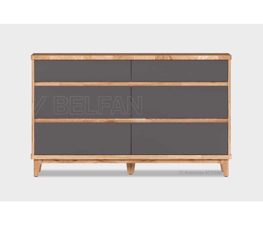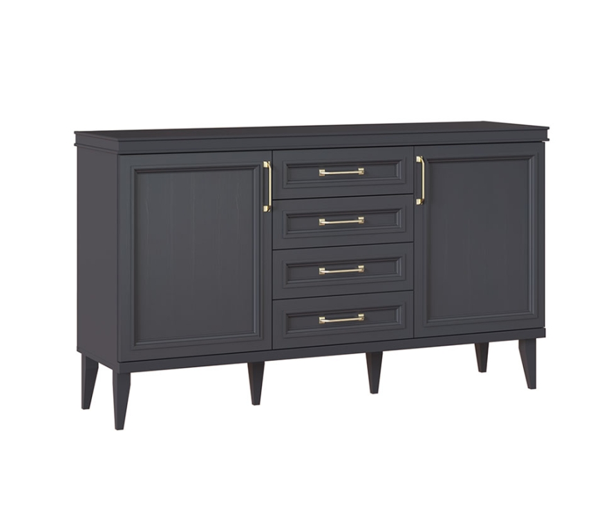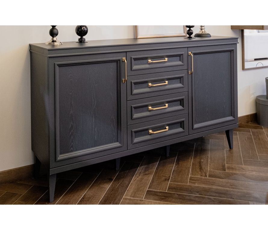 Сочетание фасадов, выполненных в цвете «серый уголь», со сверкающими металлическими ручками-скобами выглядит эффектно и дорого. Рамочные конструкции декорированы сложными филенками, столешница из ЛДСП имеет необычную геометрию с выступающими краями. Устойчивость модели придает шесть высоких, скошенных ножек-опор из букового массива, окрашенных в основной тон. Такая мебель идеально дополнит интерьер в стиле лофт или минимализм, внесет в обстановку нотки солидности и респектабельности.Комод состоит из трех отделений — центрального с четырьмя выдвижными ящиками и двух боковых с распашными дверцами. За левым и правым фасадами прячутся прочные полки из ламинированной ДСП. Ящики оснащены скрытыми направляющими, которые обеспечивают максимальный доступ ко внутреннему пространству и гарантируют бесшумную эксплуатацию изделия. Для данного товара доступны доставка и сборка.Характеристики:Комод с 2 распашными фасадами и 4 выдвижными ящиками;За боковыми фасадами полки ЛДСП;Максимальная распределенная нагрузка для выдвижных ящиков на дно 5-7 кг, при этом нагрузка должна быть распределена по всему дну (не класть тяжелые предметы, которые могут повредить и выдавить дно).Материалы:Корпус: ЛДСП 16 мм;Фасады рамочные с вставкой из ЛДСП 6 мм;Задняя стенка: ДВП;Опоры: буковые;В выдвижных ящиках используются направляющие скрытого монтажа со встроенным доводчиком;Крепежная фурнитура и механизмы ведущих производителей.