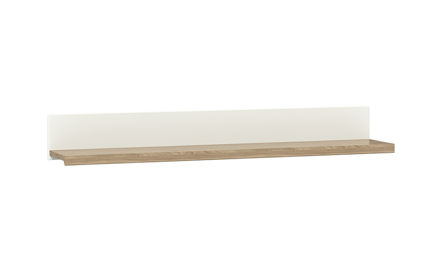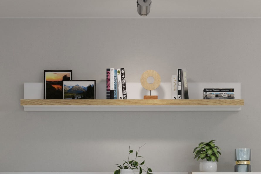 Характеристики:Полка настенная;Цвет: белый матовый, швейцарский вяз;Максимальная распределенная нагрузка на полку — 1,5 кг.