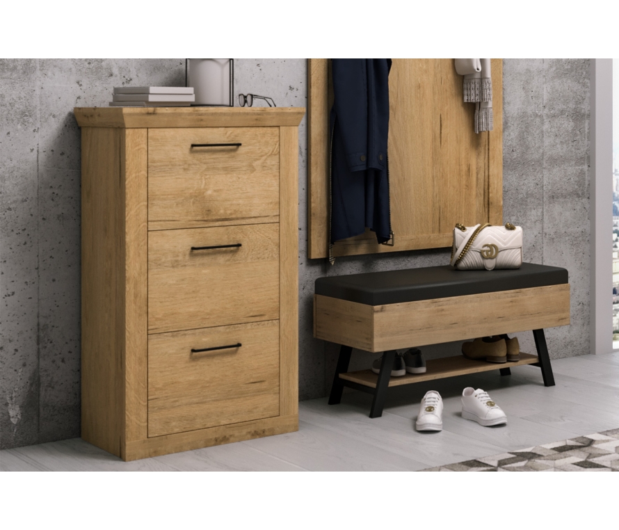 Характеристики:Тумба для обуви с тремя секциями за откидными дверями;Цвет корпуса и фасадов: дуб бунратти;Цвет задней стенки: черный графит;Цвет декоративных ручек: железо античное черное;Скрытые регулируемые опоры;Необходимо крепить к стене во избежание опрокидывания.Материалы:Для изготовления мебели используется ламинированная плита ДСП толщиной 16 и 22 мм класса эмиссии Е1;Для облицовывания кромок деталей используется высококачественный материал от ключевых производителей;Декоративные ручки металлические;Крепежная фурнитура и механизмы ведущих производителей.